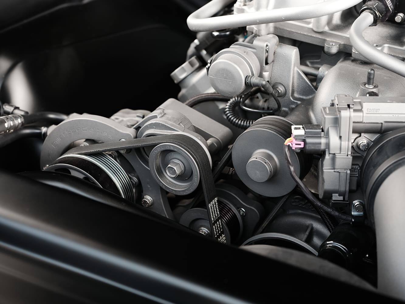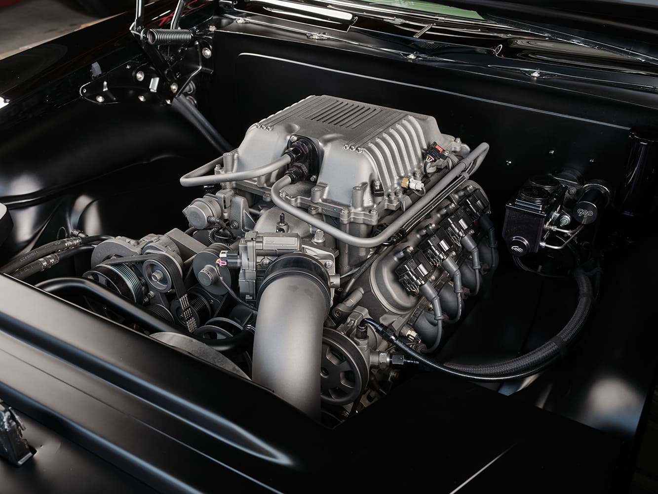 The original project retained a Chevrolet Performance LS376/525 with a 4L70E overdrive transmission. The LS376 is based on a cast-aluminum configuration featuring six-bolt, cross-bolted main caps, a nodular iron crankshaft, powdered metal connecting rods, hypereutectic aluminum pistons (10.7:1), and an ASA hydraulic roller camshaft. Once Don Hardy Race Cars worked their magic by adding the LSA supercharger, a Katech LSA cover was positioned on the second go-around. HRG Cerakoted and assembled the detailed engine once it was painted.