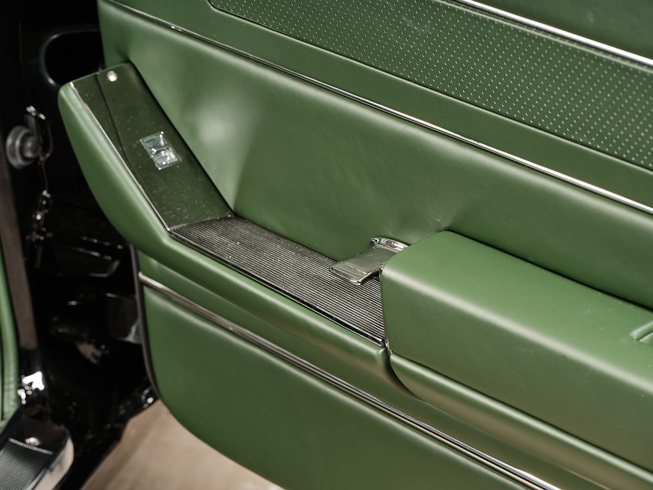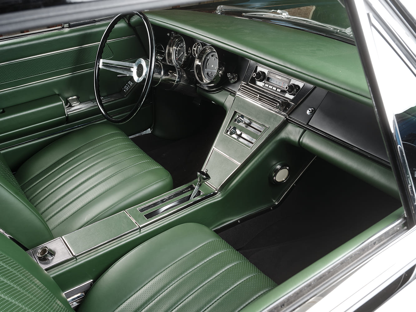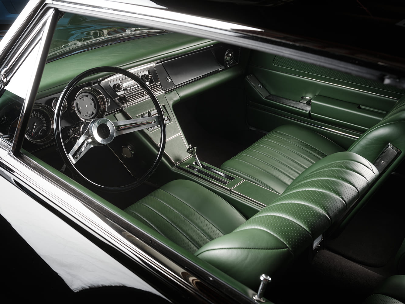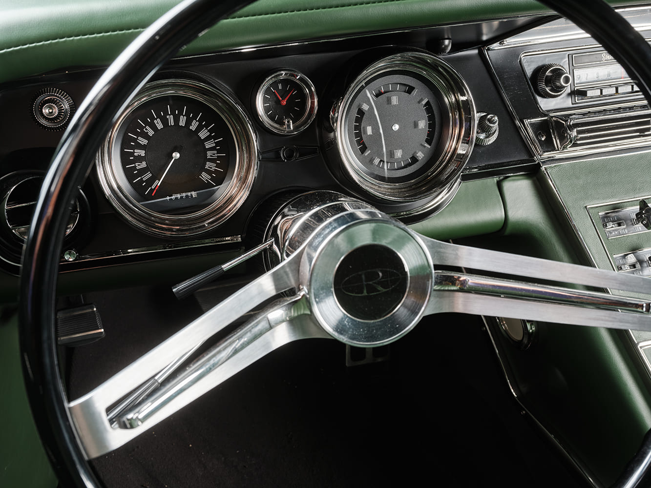 The interior features a sleek green leather cover, maintaining the original dashboard shape. The center speaker grille has been seamlessly filled, and the luggage tray has been custom-built and wrapped in leather. The texture of the OEM dash face has been entirely smoothed out and finished in a matte black, creating a striking backdrop for the custom “original-look” black and chrome gauges from Classic Instruments. These precision gauges come directly from Classic Instruments’ custom shop, complemented by a wiring harness sourced from American Autowire, expertly installed by HRG’s own Gene Anderson.