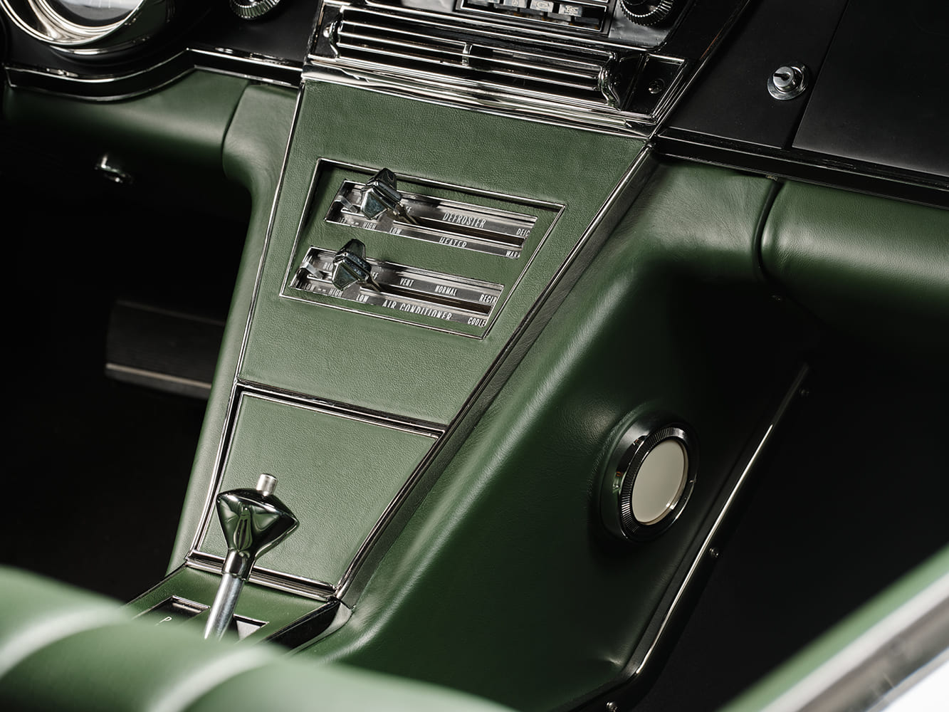 Keeping the factory steering column, they added a touch of elegance with a now-black-painted 1965 Grand Sport walnut steering wheel. The factory center console now features an HRG-fabricated acrylic shift indicator plate that includes an added “O” (overdrive) detent to accommodate the modified floor shifter, which facilitates the selection of overdrive.