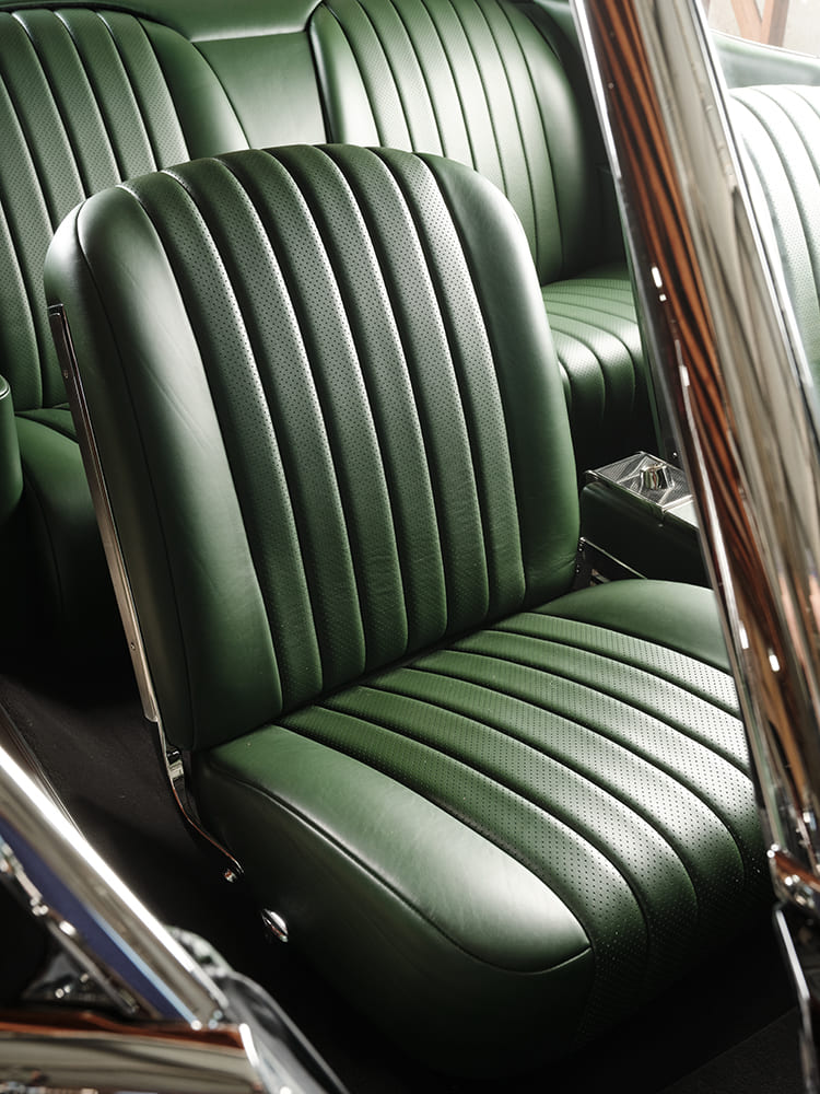 The attention to detail extends into the trunk, where the interior design seamlessly integrates with made-to-measure handcrafted luggage from Laurent Nay Maroquinerie of France. This luggage, reminiscent of bespoke pieces from Porsche or Mercedes-Benz in the late 1950s and early 1960s, provides convenient storage for tools and car care items. Todd emphasizes the collaborative spirit behind this build: “It’s easy to work with a builder when you have a similar vision for the car being built.” It’s clear that Todd and Smith shared a common goal. Phil Cato masterfully executed the stunning stitchwork on the Relicate leather interior from Cato’s Custom Upholstery.