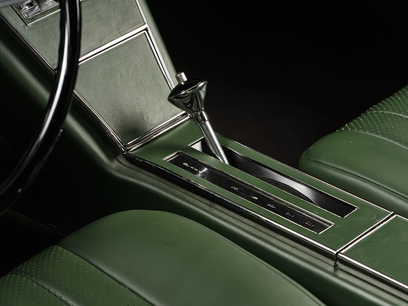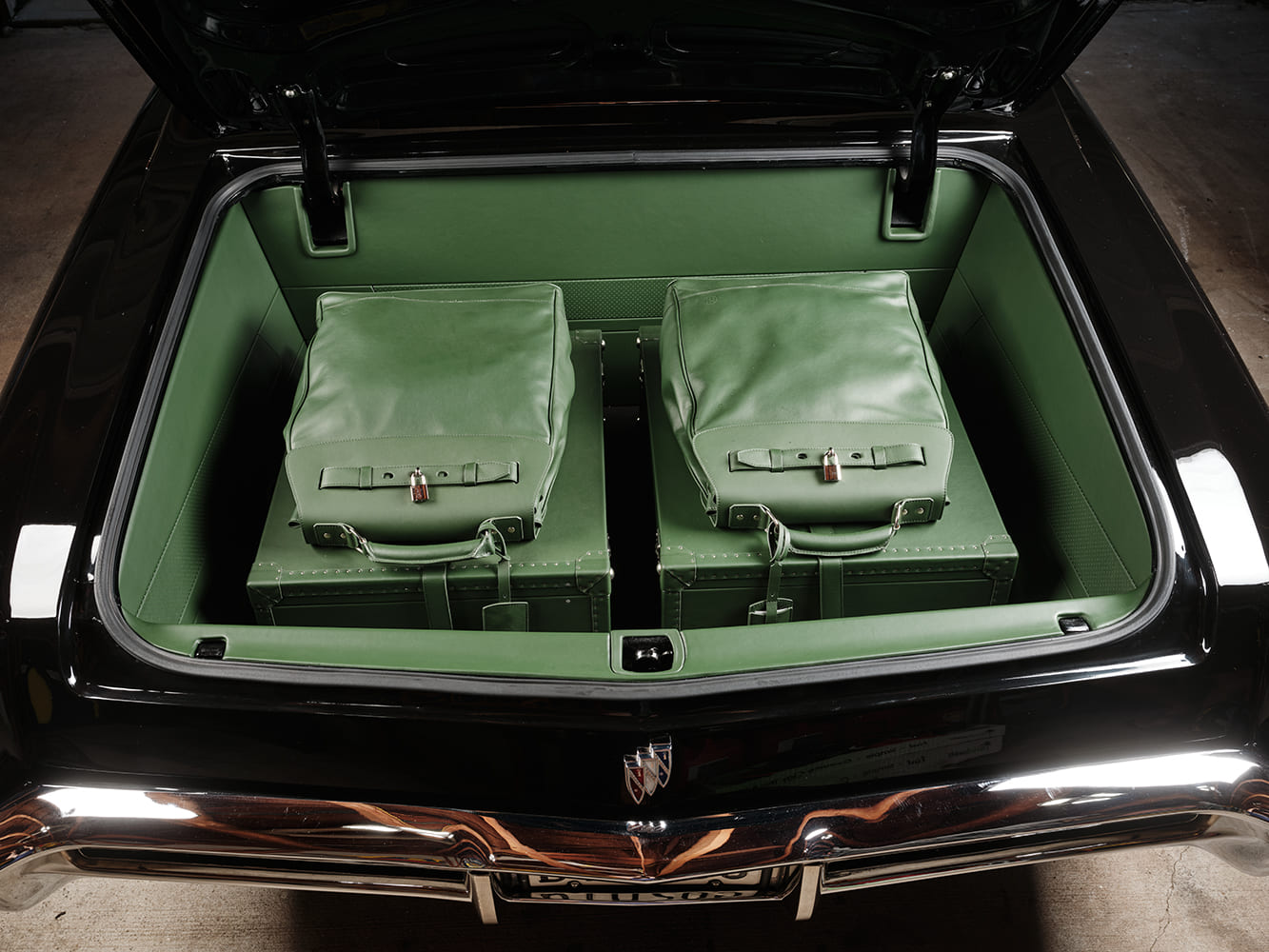 In the rear, the original rear end was preserved, complete with its 3.23 ring-and-pinion, a Ridetech air suspension, and the addition of a Panhard bar. The brake system is based on a factory pedal assembly combined with factory drilled-and-slotted rotors and four-piston GM calipers. Schott Accelerator d.concave forged aluminum two-piece welded wheels, finished in titanium and chrome, measure 18×8 and 20×10, enhancing the corners. A distinctive feature is a modified Schott center cap that showcases the Riviera “R” logo (in dark green, reflecting the interior color). The Nitto NT555G2 rubber in sizes 245/45ZR18 for the front and 305/35ZR20 for the rear is used.