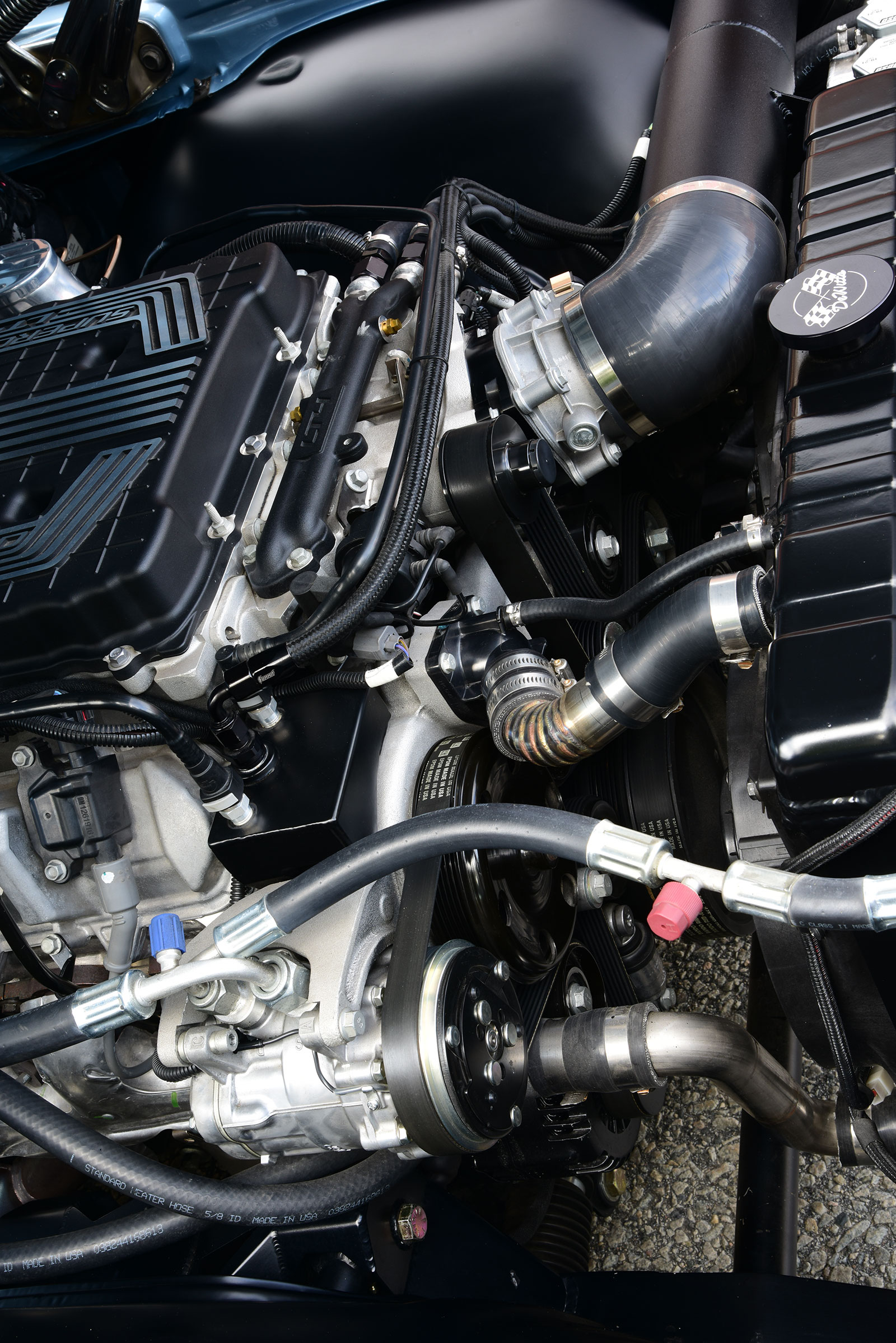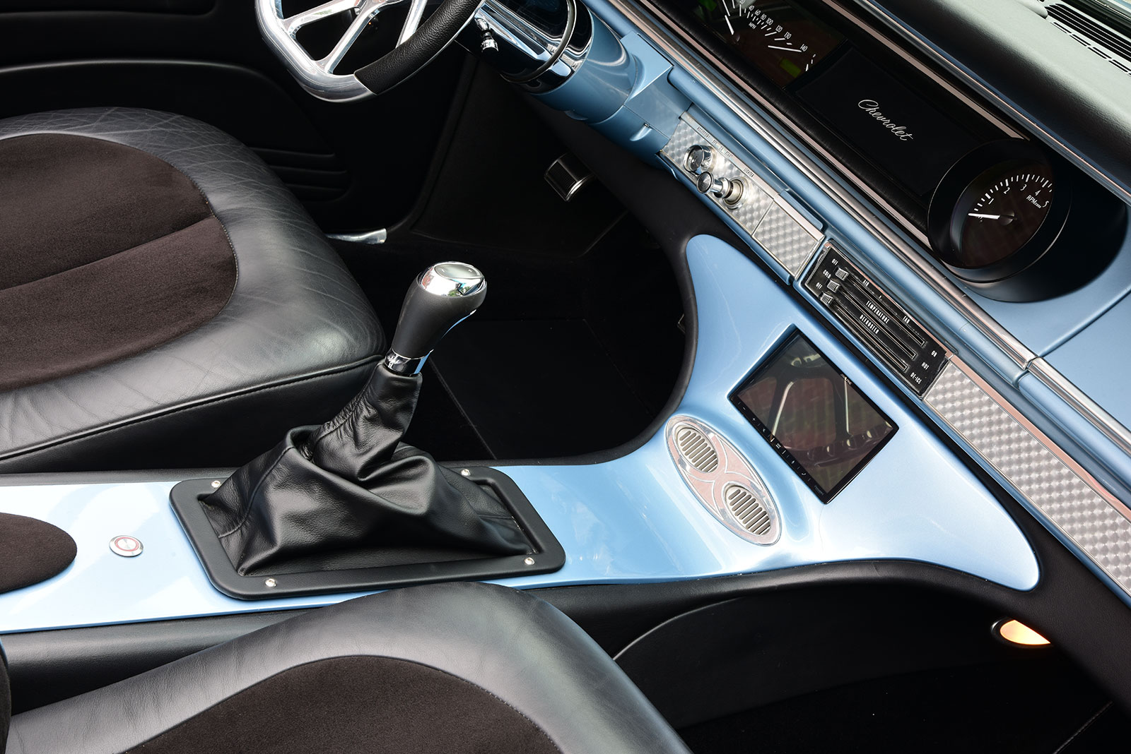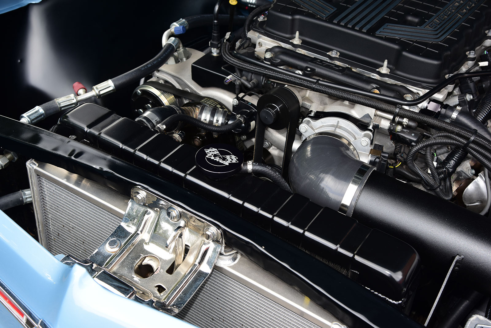 For plenty of punch underhood, Michael chose one of Chevrolet Performance’s ultimate crate engines. Direct from the heart of the Corvette C7 Z06, the 6.2L LT4 engine is the most powerful offering for a production car in Chevrolet history. Starting with a cast-aluminum block featuring six-bolt, cross-bolted main caps, it’s packed with a modern speed shop full of go fast parts, including a forged steel crank linked to matching forged powdered-metal rods capped by forged aluminum pistons getting bumped by a hydraulic roller cam. Up top, a set of A356T6 Rotocast aluminum cylinder heads, as cast, with 65.5cc chambers make seamless power especially when matched to a 1.7L Eaton R1740 TVS Supercharger with direct-injection and 87mm throttle body. A factory coil-pack ignition lights the fire with exhaust flowing through a set of factory stainless headers to a 3-inch stainless custom exhaust with Borla mufflers all by Procision Industries of Taunton, Massachusetts. Additional cool bits include a Holley Accessory drive, DeWitts radiator, and cold air intake by Procision Industries. To move the goods, a GM 8L90E transmission connects to a custom driveshaft by Precision Shaft Technologies. It’s all good for a tire-scorching 640 hp on command. The car was then rewired by Rothspeed using Chevrolet Performance controllers as well as custom harnesses. Finally, Procision gets the nod for dialing it all in and setting the final tune.