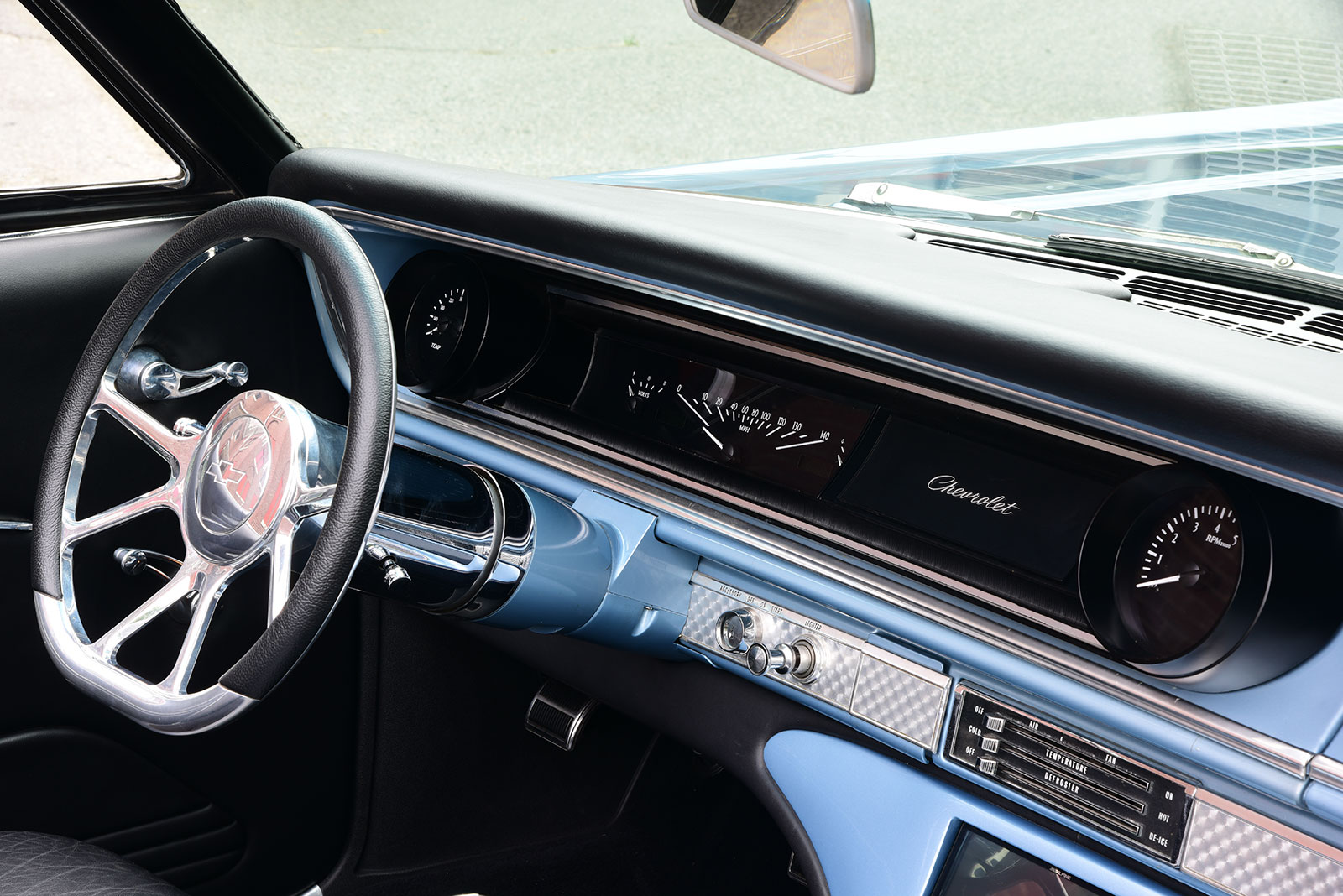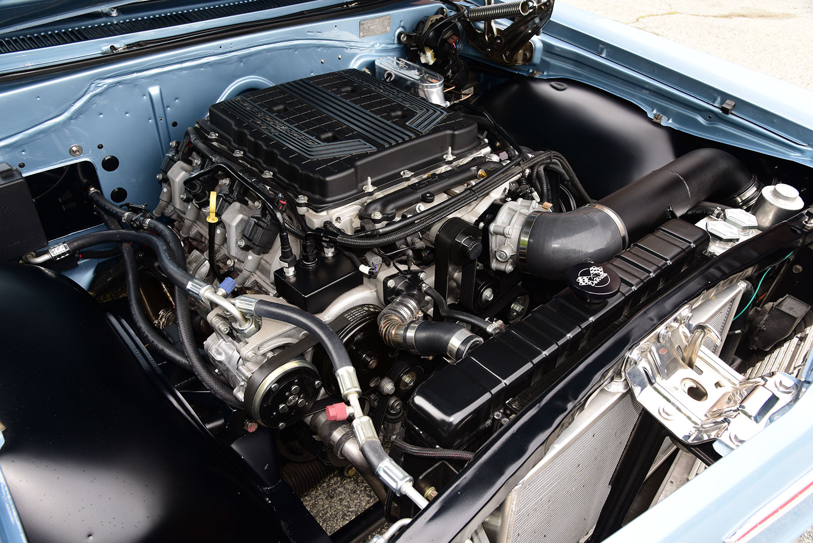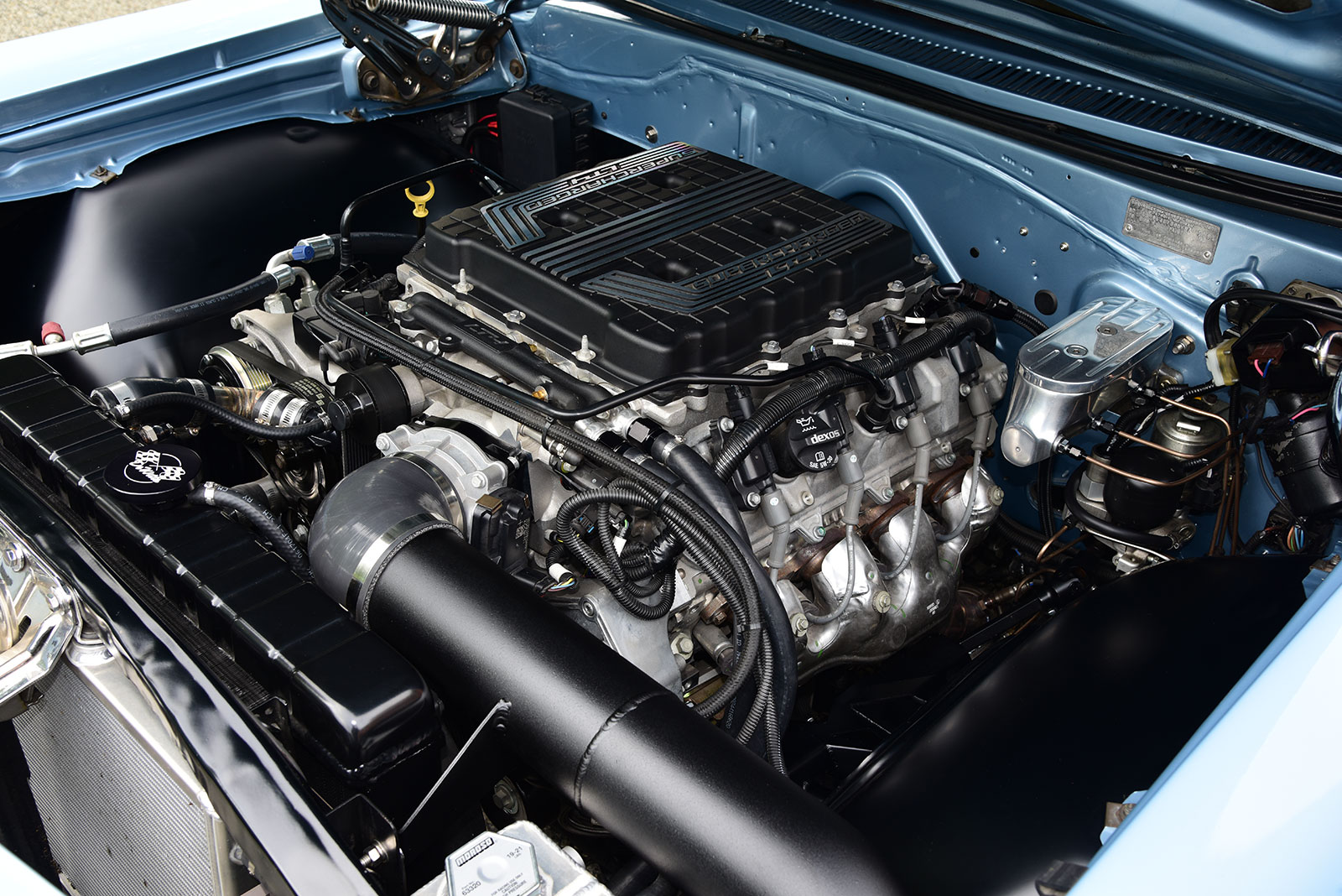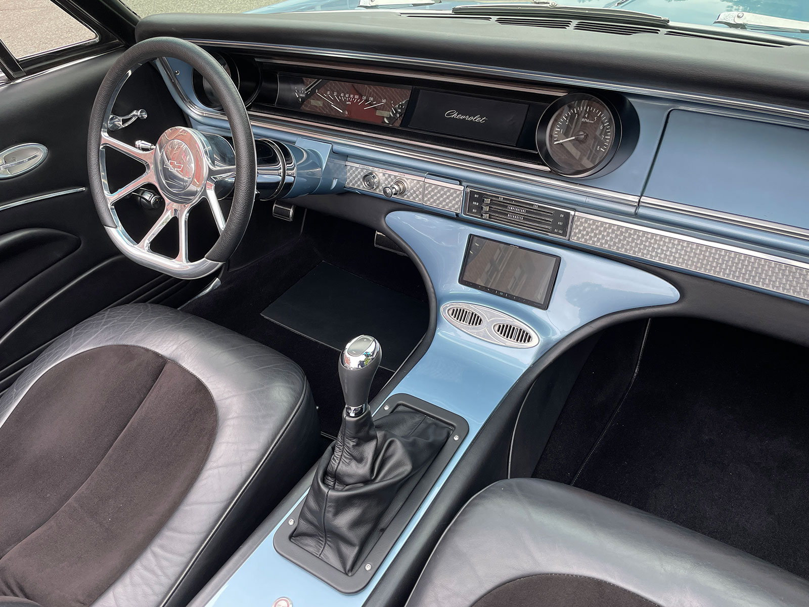 For plenty of punch underhood, Michael chose one of Chevrolet Performance’s ultimate crate engines. Direct from the heart of the Corvette C7 Z06, the 6.2L LT4 engine is the most powerful offering for a production car in Chevrolet history. Starting with a cast-aluminum block featuring six-bolt, cross-bolted main caps, it’s packed with a modern speed shop full of go fast parts, including a forged steel crank linked to matching forged powdered-metal rods capped by forged aluminum pistons getting bumped by a hydraulic roller cam. Up top, a set of A356T6 Rotocast aluminum cylinder heads, as cast, with 65.5cc chambers make seamless power especially when matched to a 1.7L Eaton R1740 TVS Supercharger with direct-injection and 87mm throttle body. A factory coil-pack ignition lights the fire with exhaust flowing through a set of factory stainless headers to a 3-inch stainless custom exhaust with Borla mufflers all by Procision Industries of Taunton, Massachusetts. Additional cool bits include a Holley Accessory drive, DeWitts radiator, and cold air intake by Procision Industries. To move the goods, a GM 8L90E transmission connects to a custom driveshaft by Precision Shaft Technologies. It’s all good for a tire-scorching 640 hp on command. The car was then rewired by Rothspeed using Chevrolet Performance controllers as well as custom harnesses. Finally, Procision gets the nod for dialing it all in and setting the final tune.