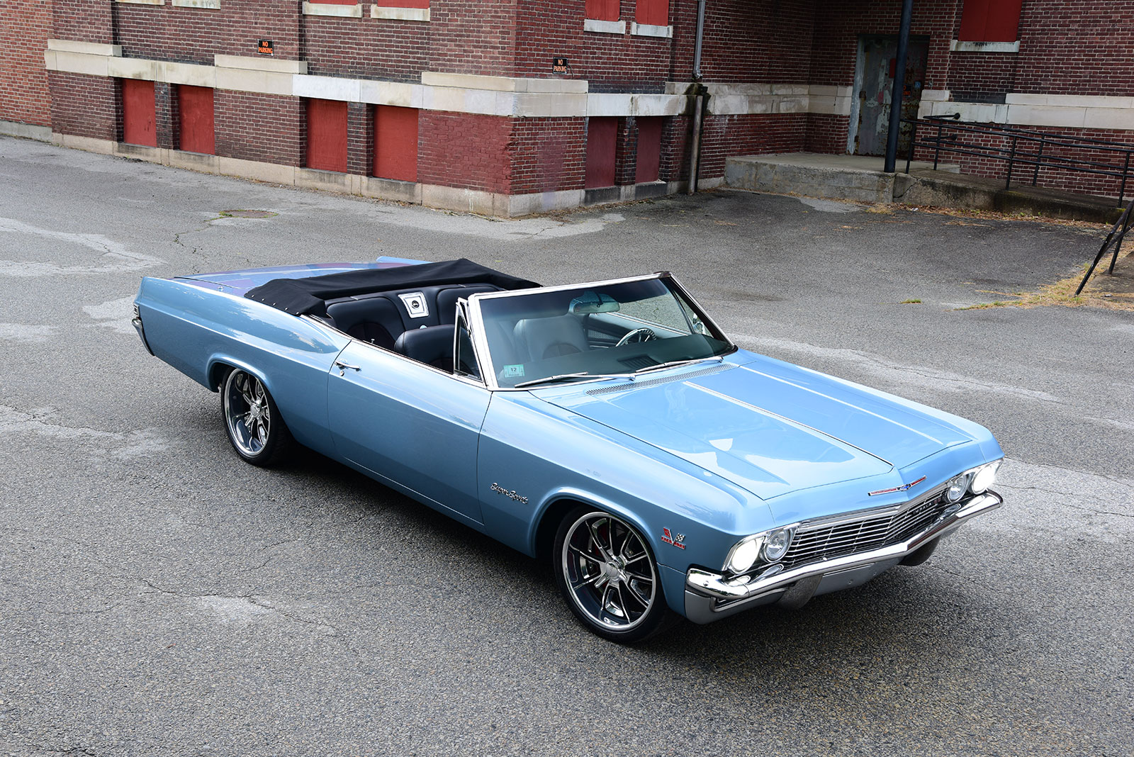 Looking back at history, it’s easy to see that Chevrolet’s designers hit a homerun when it came to the fourth generation (1965-70) of the Impala, especially with the refreshingly elegant body lines of the sports coupe and convertible. The model was so good that the manufacturer’s all-time annual industry sales records were smashed with over 1 million units sold in the U.S. alone. Add in details like their exclusive, new, full-perimeter frame with coil suspension as well as choices of inline six cylinder, small block, or big block V8s and it’s easy to see why it was a hit among consumers and hot rodders alike. The stunning 1965 Impala SS convertible owned by Michael Frotten of Charlotte, North Carolina, is a perfect example of a full size performance car fusing its factory pedigree with modern-day technology.