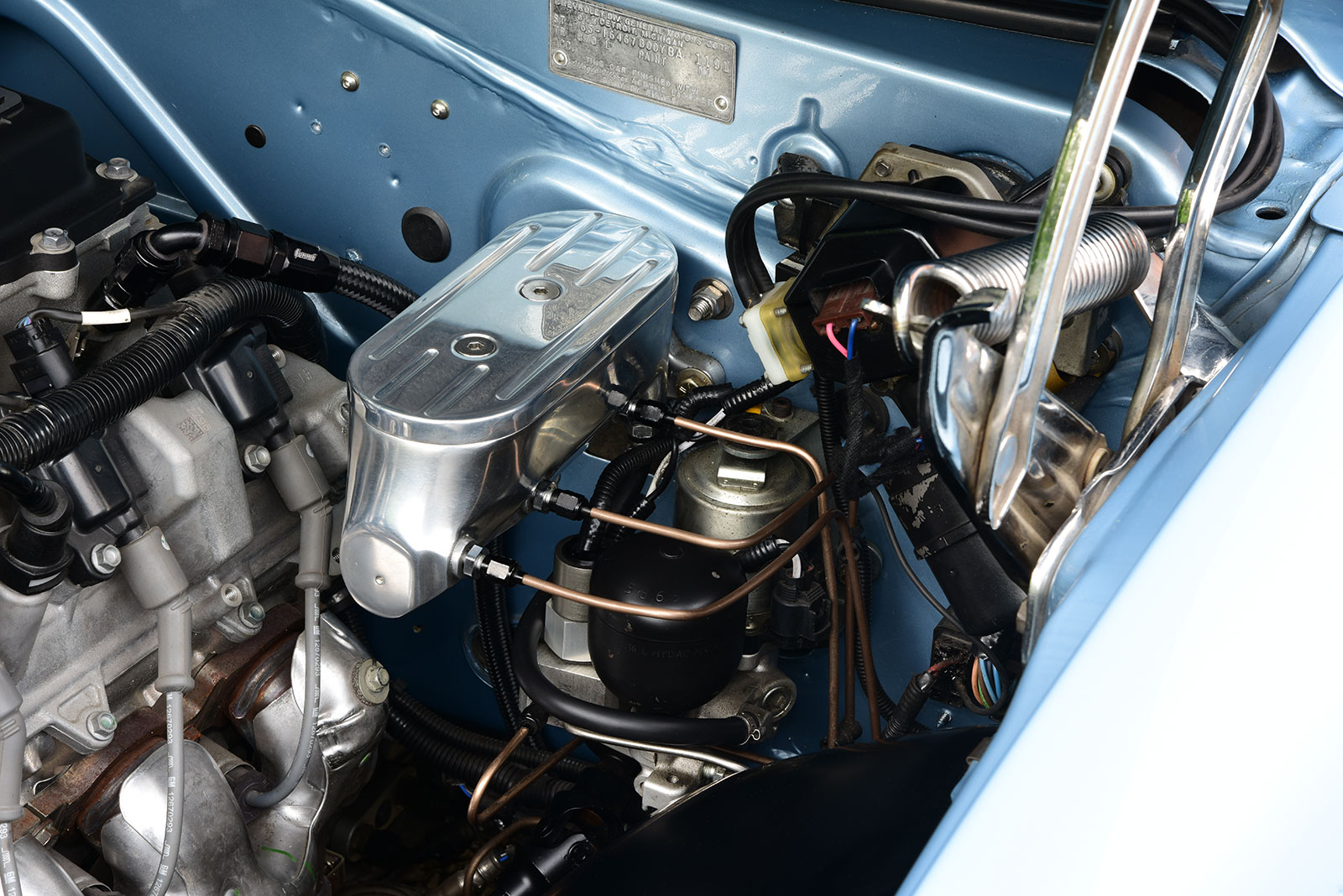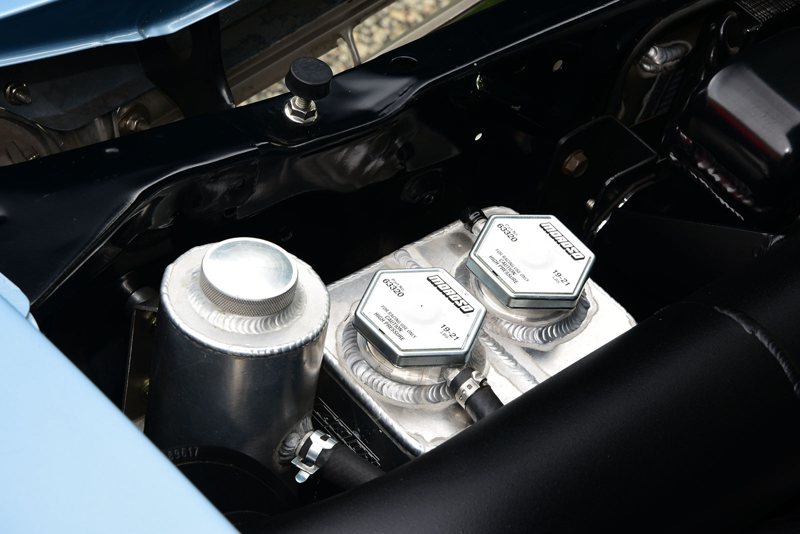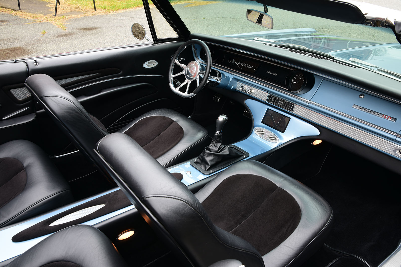 When it came time for the business office, the factory dash was packed with new Dakota Digital VHX dials showcasing a black alloy background while a Prism-series D-shaped Billet Specialties steering wheel carves the course through a tilt ididit steering column and Vintage Air adds a cool breeze. For plenty of comfort on the long haul, Michael contacted Jeffrey Phipps Custom in Palm Beach to stitch the threads, which included fabricating a flowing front to rear console complemented by custom bucket seats wrapped in a combination of black leather and matching Ultrasuede. The team also wrapped the dash pad, crafted unique side panels, and completed the job with wool carpeting and a fresh convertible top. The completed car was then enjoyed for the next few years with Michael laying down plenty of miles until the itch for even more performance knocked on the door.