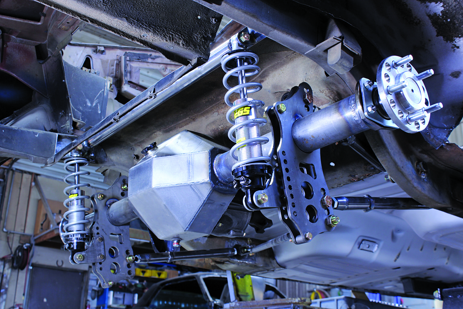 To replace the original springs and shock absorbers, Colin chose a four-link suspension kit from JEGS (PN 555-64650) with coilover shocks. Designed for rearend housings with 3-inch axle tubes, these four-link kits come with ¼-inch-thick housing and frame brackets, four-link bars, threaded inserts made from 4130 chromoly steel, and 5/8-inch rod ends. The axle brackets also serve to mount coilovers and are drilled to accept an antiroll bar.