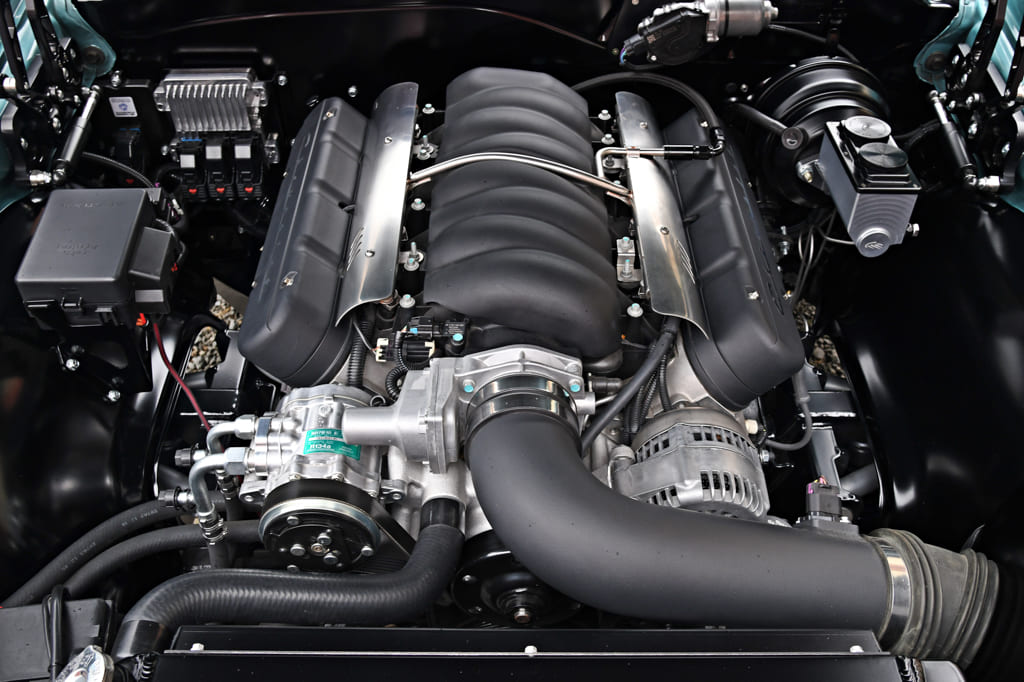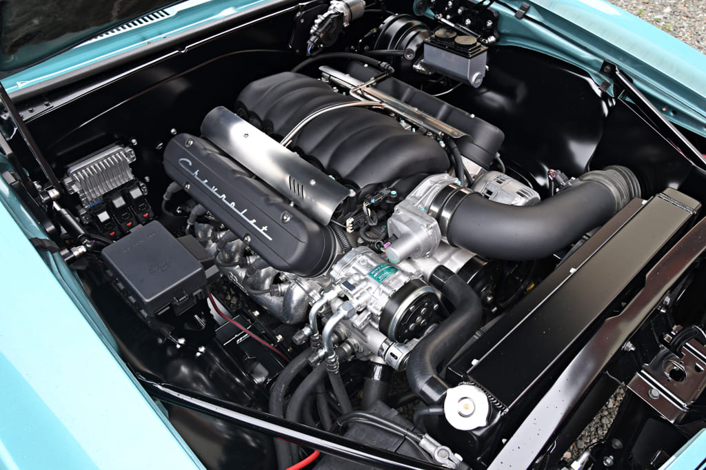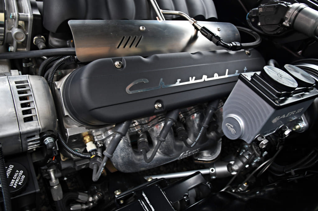 The Steel Town crew was impressed with the paint- and bodywork, however, some minor modifications were needed to fit the body over the new ’rails. To prepare for the fresh Chevrolet Performance LS3/4L65E drivetrain, the crew cleaned up the engine bay and smoothed the firewall. It was then refinished in Sikkens Pure Black satin paint to give it that vintage Chevy appearance.