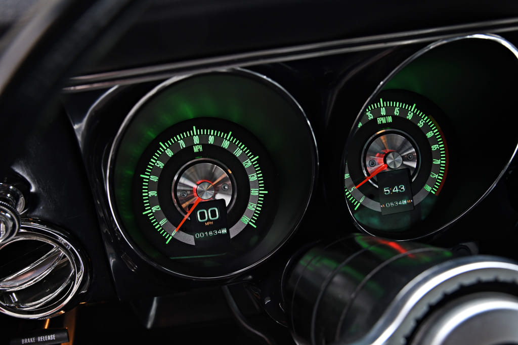 Once the body and chassis were brought back together, the crew set its sights on the interior. The previous owner had completely refurbished the cockpit, which was reseated in stock-appearing houndstooth cloth and black vinyl. It was done exceptionally well, so the only thing added was a set of Dakota Digital RTX gauges to give it a more modern flair.