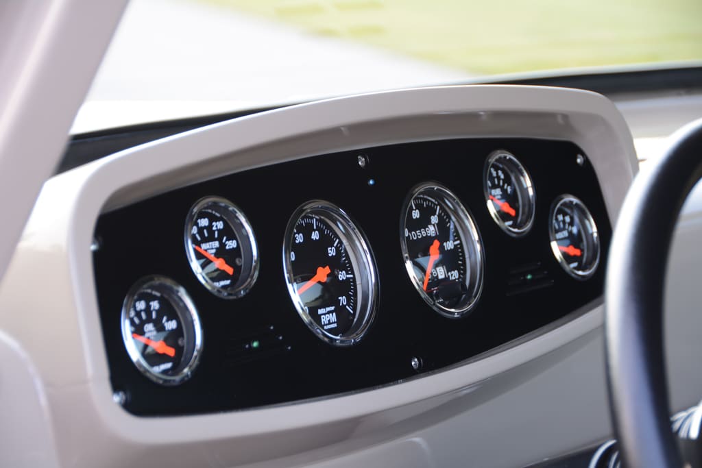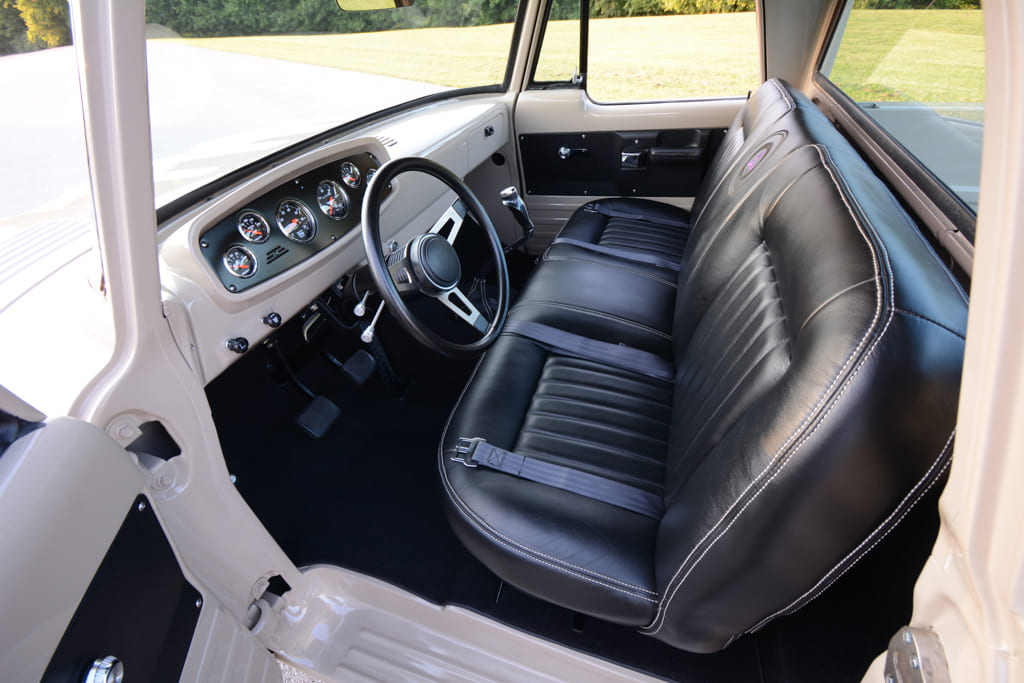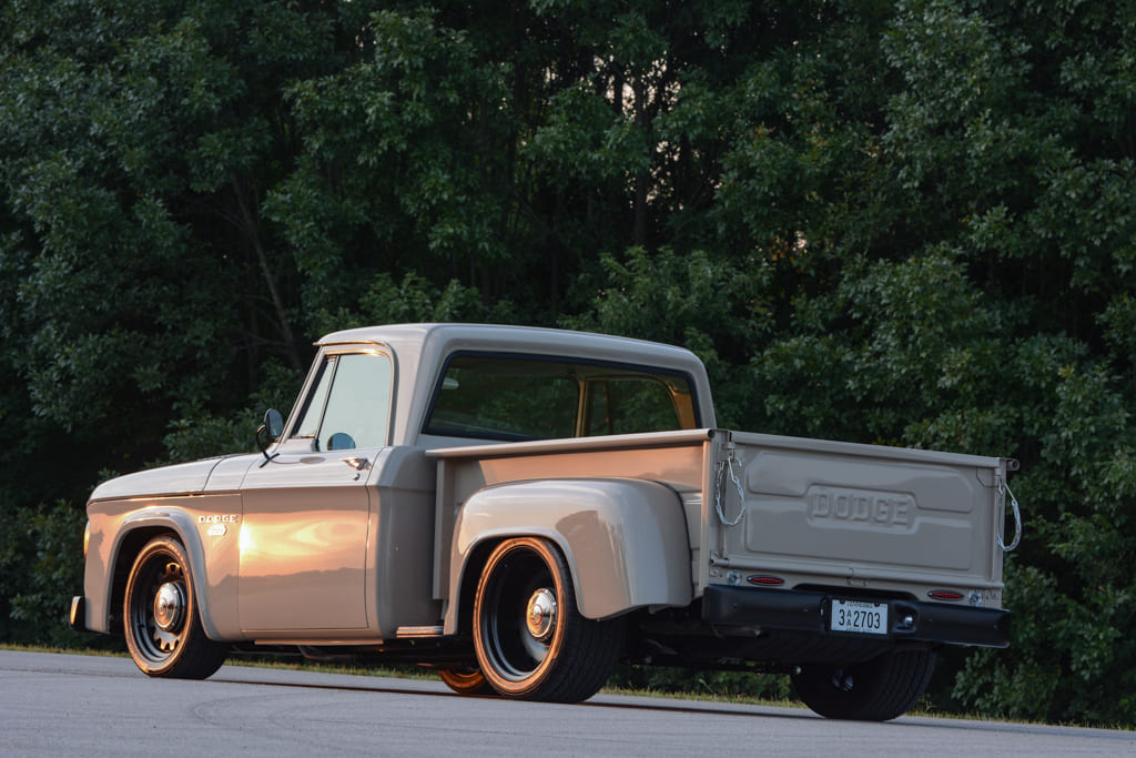 Inside, the truck has a subtle appearance thanks to Mojave Sand paint and black leather. Chris Hillman handled some of the interior work, while Jim’s wife, Angela, stitched the customized seat upholstery with the ’60s Dodge logo in the middle. The dash is modernized with a set of AutoMeter gauges inside a custom bezel. An ididit tilt steering column places the Dodge Challenger steering wheel in the perfect position. Creature comforts are at a minimum, as the truck does not have a radio, air conditioning, or power windows. A Painless Performance Products wiring harness is hidden from view.