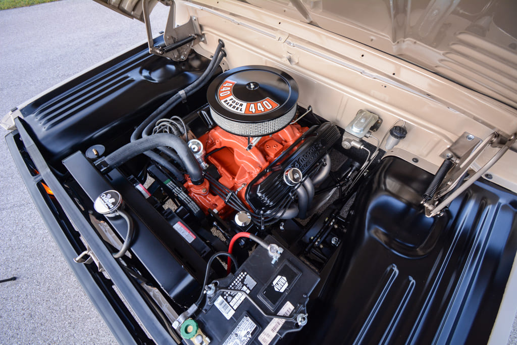 The engine wears Chrysler orange paint with black Mopar performance valve covers, providing a nice contrast in colors. He also used black on the air cleaner with factory-style 440 decals, and then painted the inner fenders and aluminum champion radiator in a semigloss black for a superclean finish. The alternator and power steering pump are also finished in black and use custom bracketry. Behind the 440 is a TREMEC TKO 500 five-speed manual transmission with a mid-shift relocation kit to position the shifter properly inside the cab. Jim used a Hurst shifter with a custom pistol grip handle for the perfect Mopar finishing touch. A McCleod clutch transfers the power, while a custom driveshaft hooks it all up.