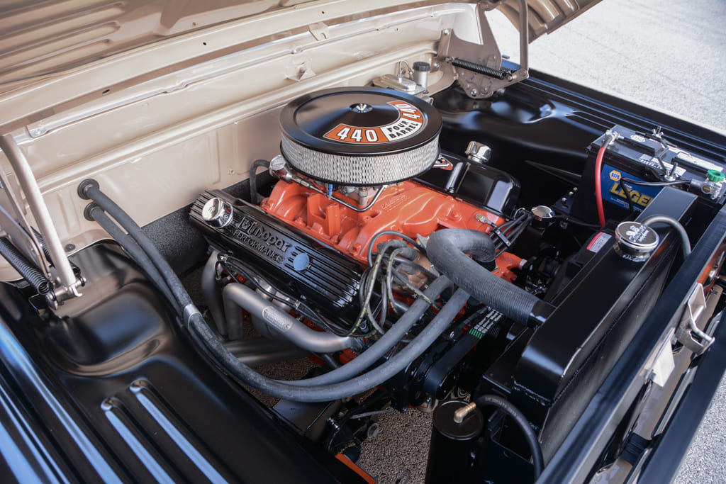 Horsepower comes from a tried-and-true Mopar muscle car. The 440ci big-block Chrysler originally powered a ’69-1/2 Dodge A12 Super Bee. Jim kept it mostly stock, utilizing the original rotating assembly with 10.5:1 compression ratio. Tommy’s Machine Shop handled the necessary machine work on the block and cylinder heads. Jim upgraded to an Edelbrock Performer 440 intake manifold, and a dual-line Holley four-barrel carburetor. A billet electronic distributor delivers spark through a set of Accel 8mm plug wires. Coated Hedman long-tube headers lead into a 2-1/2-inch exhaust system with MagnaFlow mufflers.