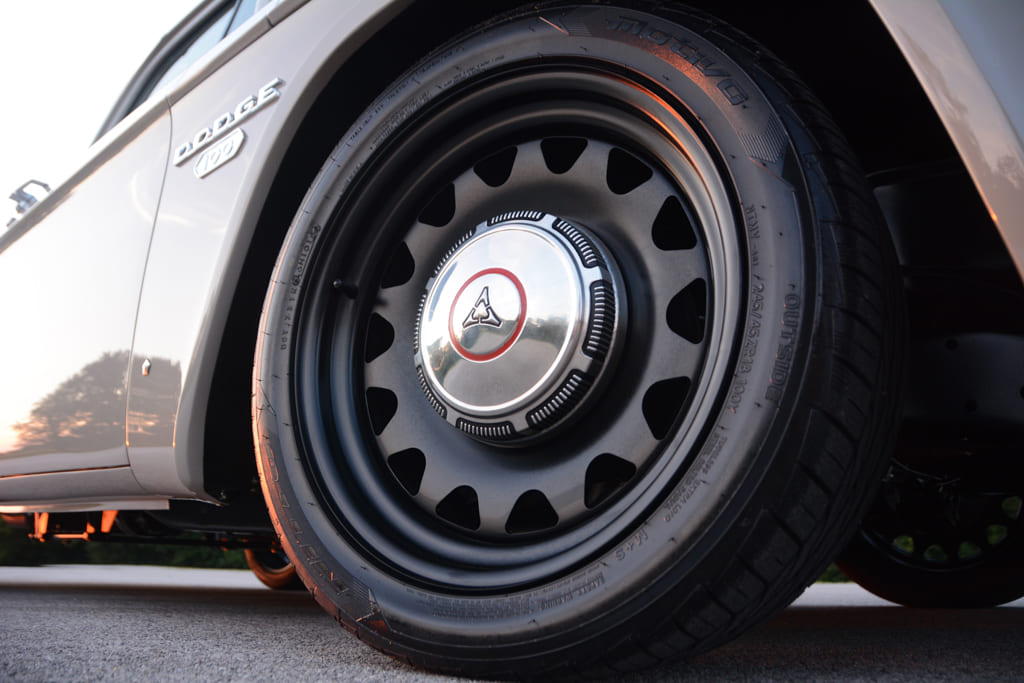 The emblems are the only polished components on the exterior, as the grille and bumpers are painted satin black for a clean look that coincides with the satin black wheels. The artillery-style wheels are from Detroit Steel and measure 18×8 up front and 20×11 out back and wear Nitto Motivo rubber, sized at 245/45ZR18 and 315/35ZR20, respectively. The original-style dog dish caps give the combination a little extra pop, thanks to a polished finish and red pinstriping.