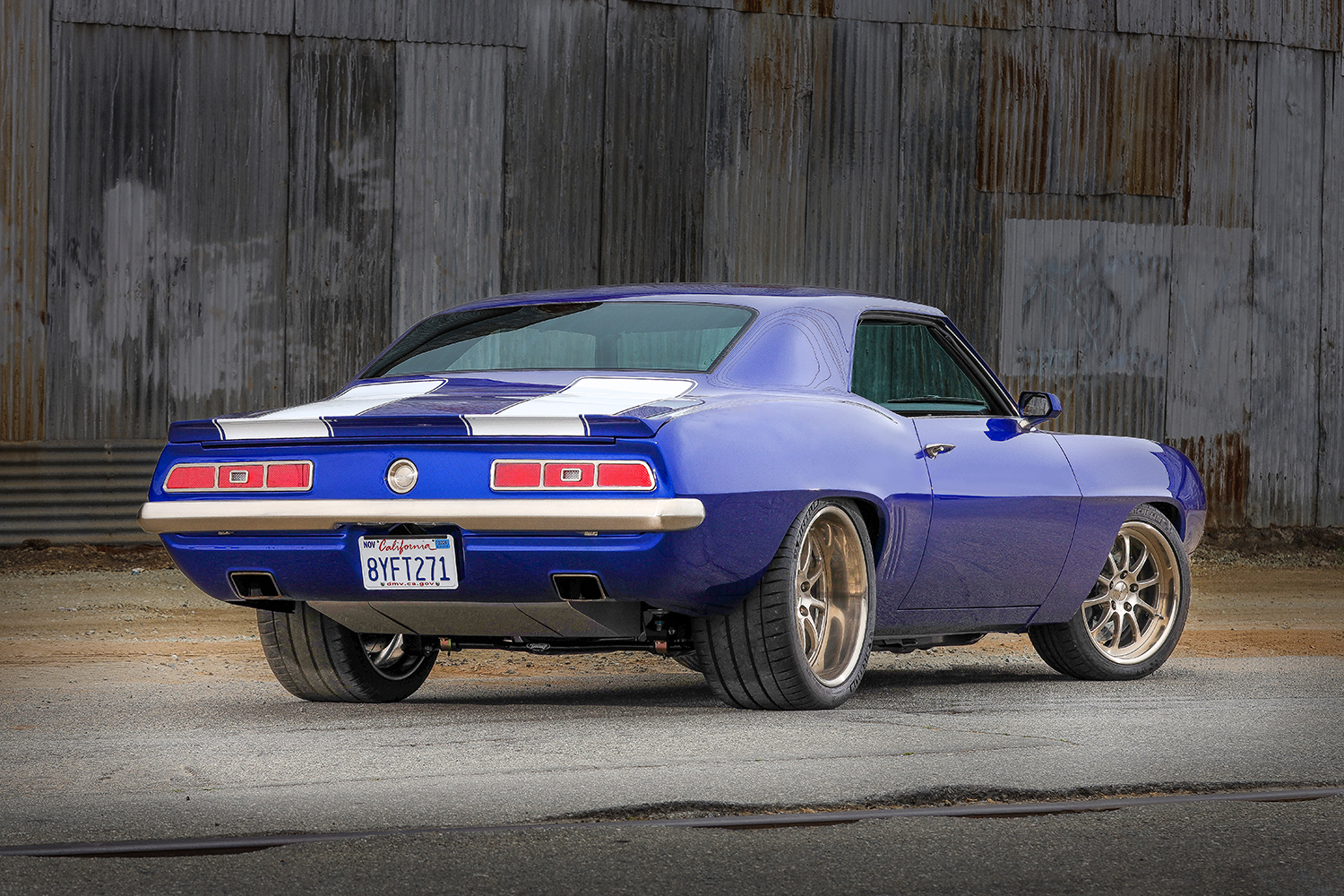 Outside, the Camaro features stunning originality combined with subtle enhancements. The bodywork executed by Gary’s Rods and Restorations looks brilliant under the Axalta Blue mix with Corvette Code 10 White rally stripes. Both the front and rear bumpers have been tucked for a cleaner appearance, while the Detroit Speed mini-tubs provide the necessary real estate to house the bulbus meats out back.