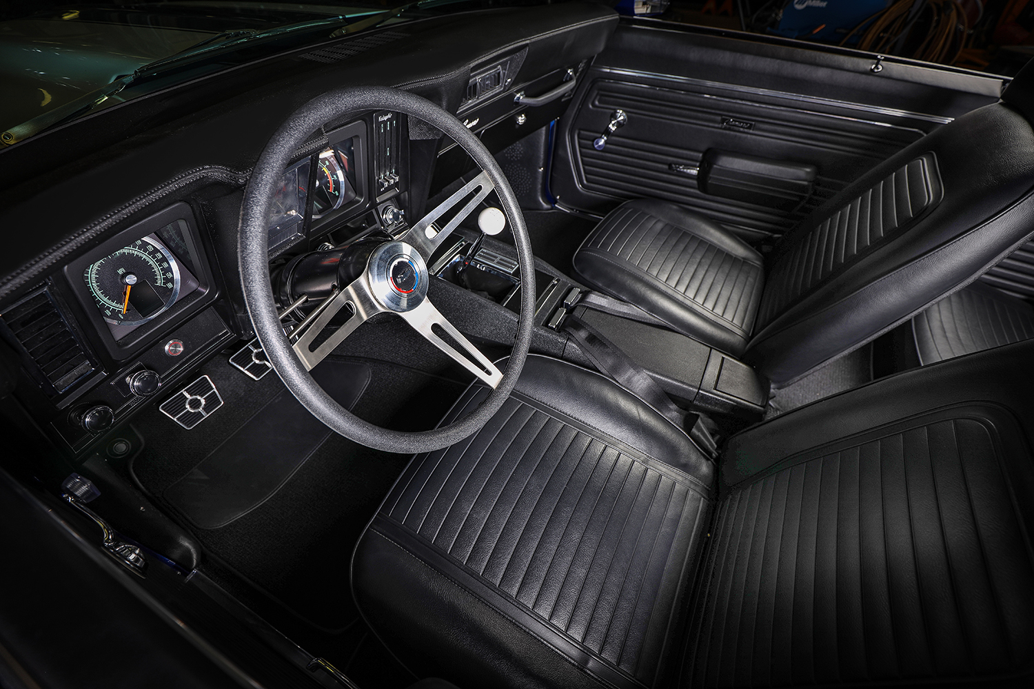 Inside, Michael’s Camaro remains true to its roots with a factory-inspired interior, carefully refined by Finish Line Interiors in Santa Clara, California. Stock seats provide period-correct aesthetics while offering modern comfort. Black Mercedes German loop carpet adds a touch of sophistication throughout.