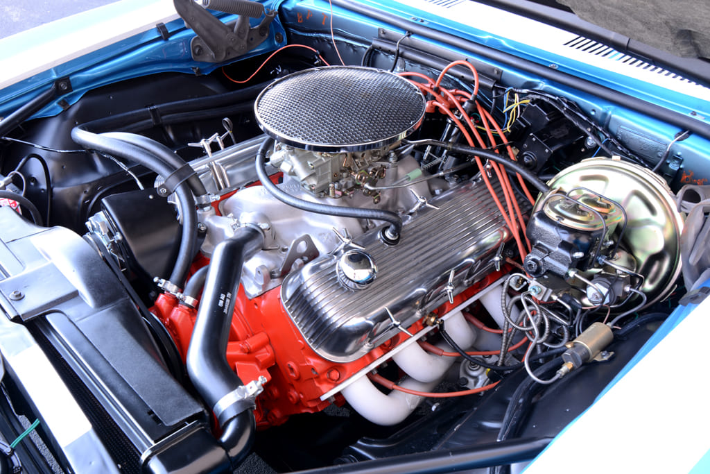 007 Under the hood of the 1969 Camaro showing a detailed engine setup with chrome and red components
