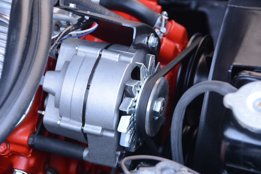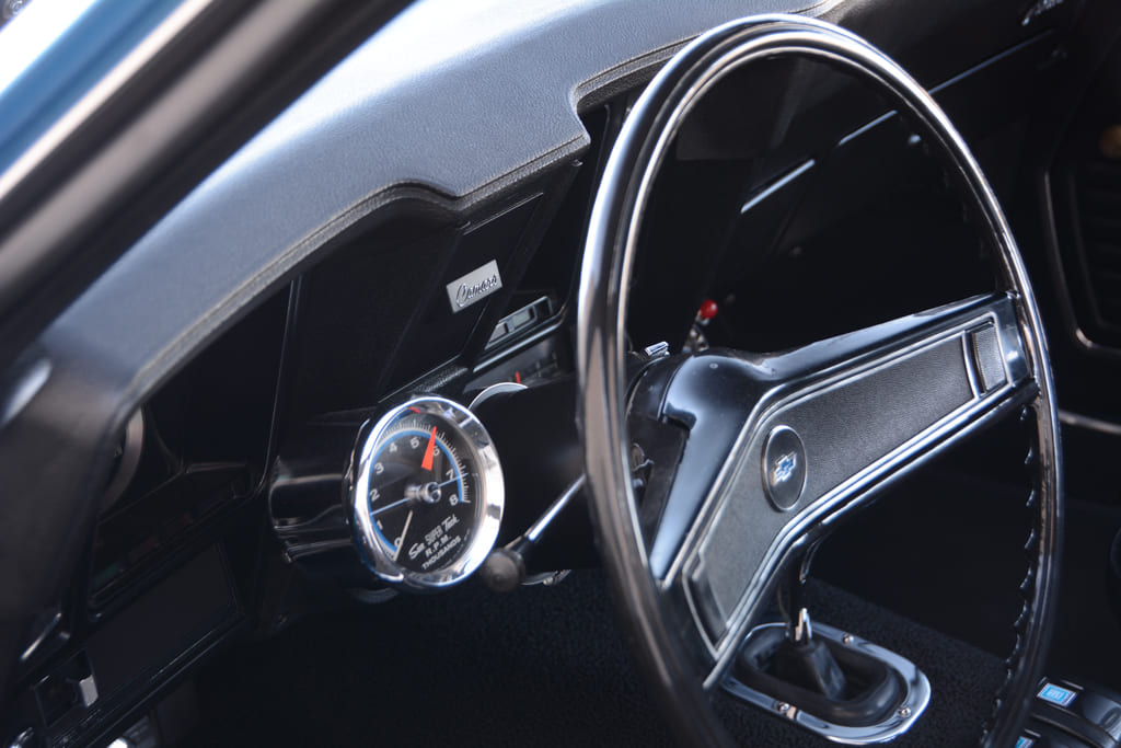 Period-correct Day Two components include Cal Custom valve covers, fly eye air cleaner, Mallory plug wires, Hooker headers, Hurst line lock, Sun Super Tach, Sun blue-line gauges, Gabriel Hijacker shocks, and a set of 15×3.5 and 15×8.5 slotted mag wheels. When Jim bought the car, it still had a Lakewood driveshaft loop and Lakewood traction bars, which were dated 1971 and installed during the car’s drag racing days. He restored those components and installed them for the perfect finishing touches to the Day Two 016 Close up of the auxiliary gauges under the dashboard highlighting their chrome detailing