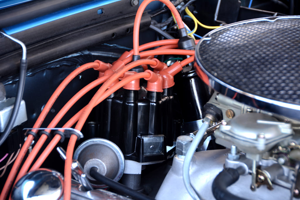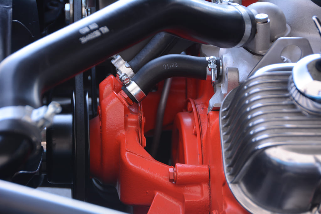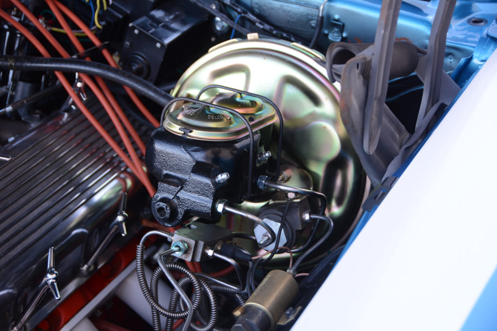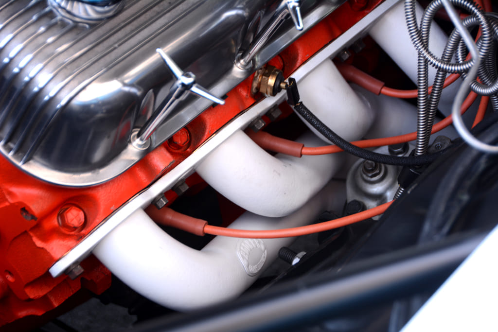 010 Detailed engine shot of the 1969 Camaro showing white exhaust headers and spark plug wires