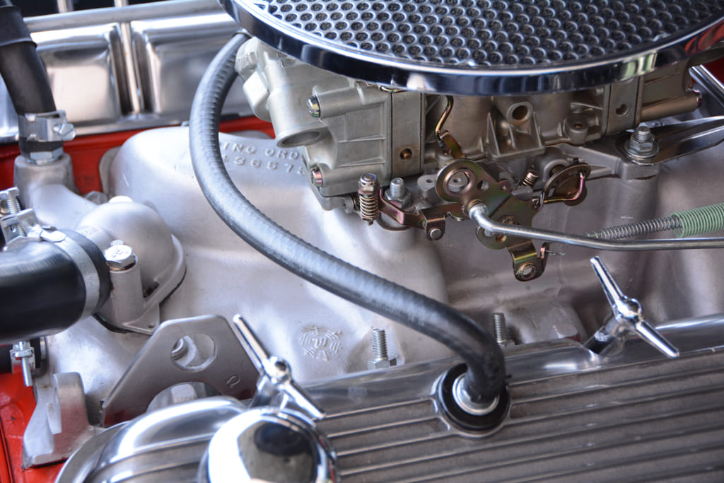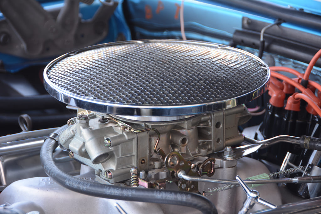 009 Close up of the carburetor atop the engine in the 1969 Camaro detailing the complex linkage and air filter