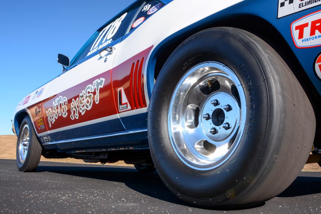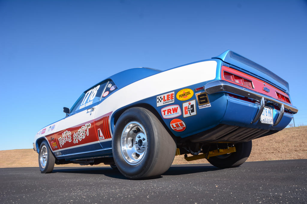 003 Rear low angle view of the 1969 COPO Camaro showing its lifted stance and drag racing tires