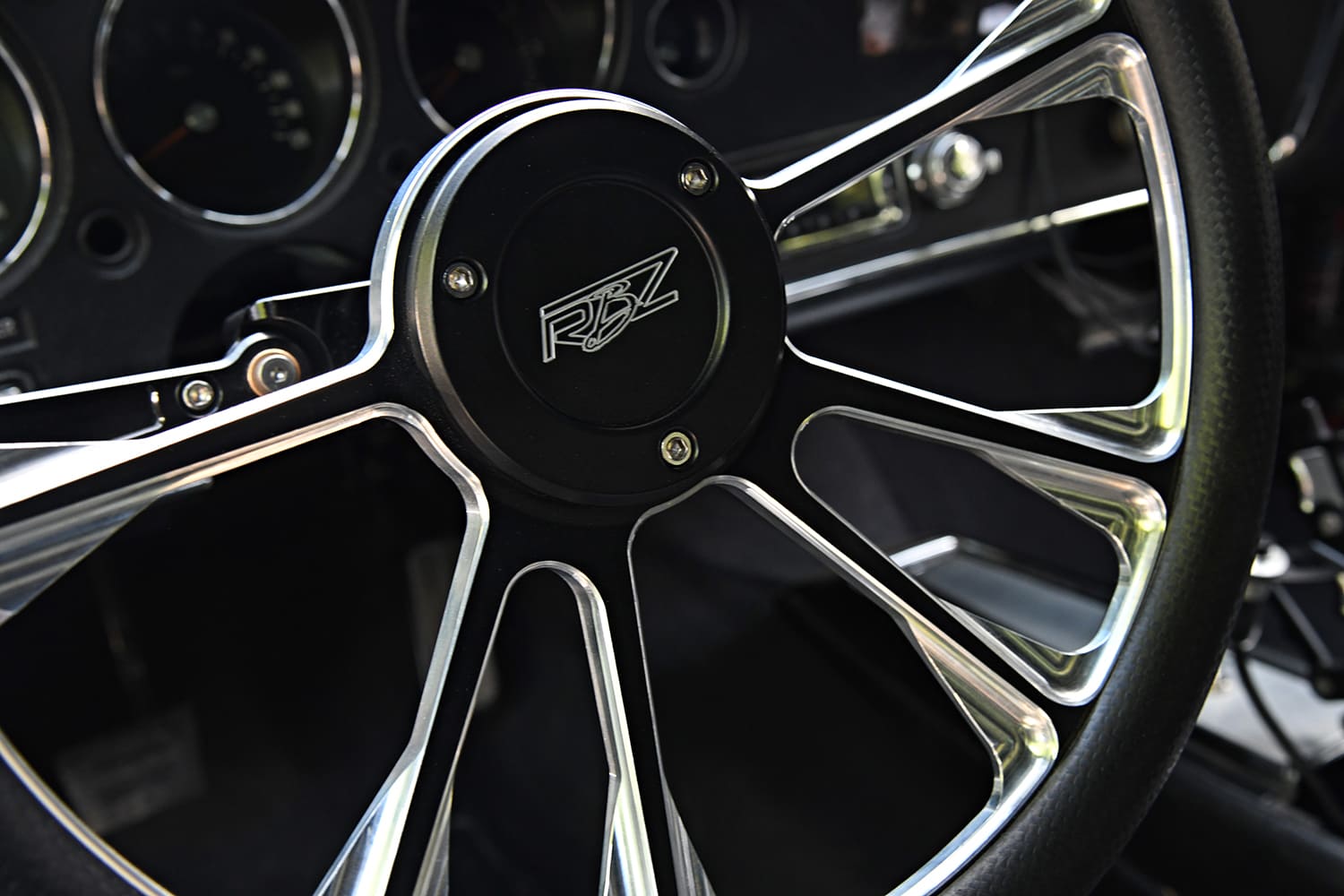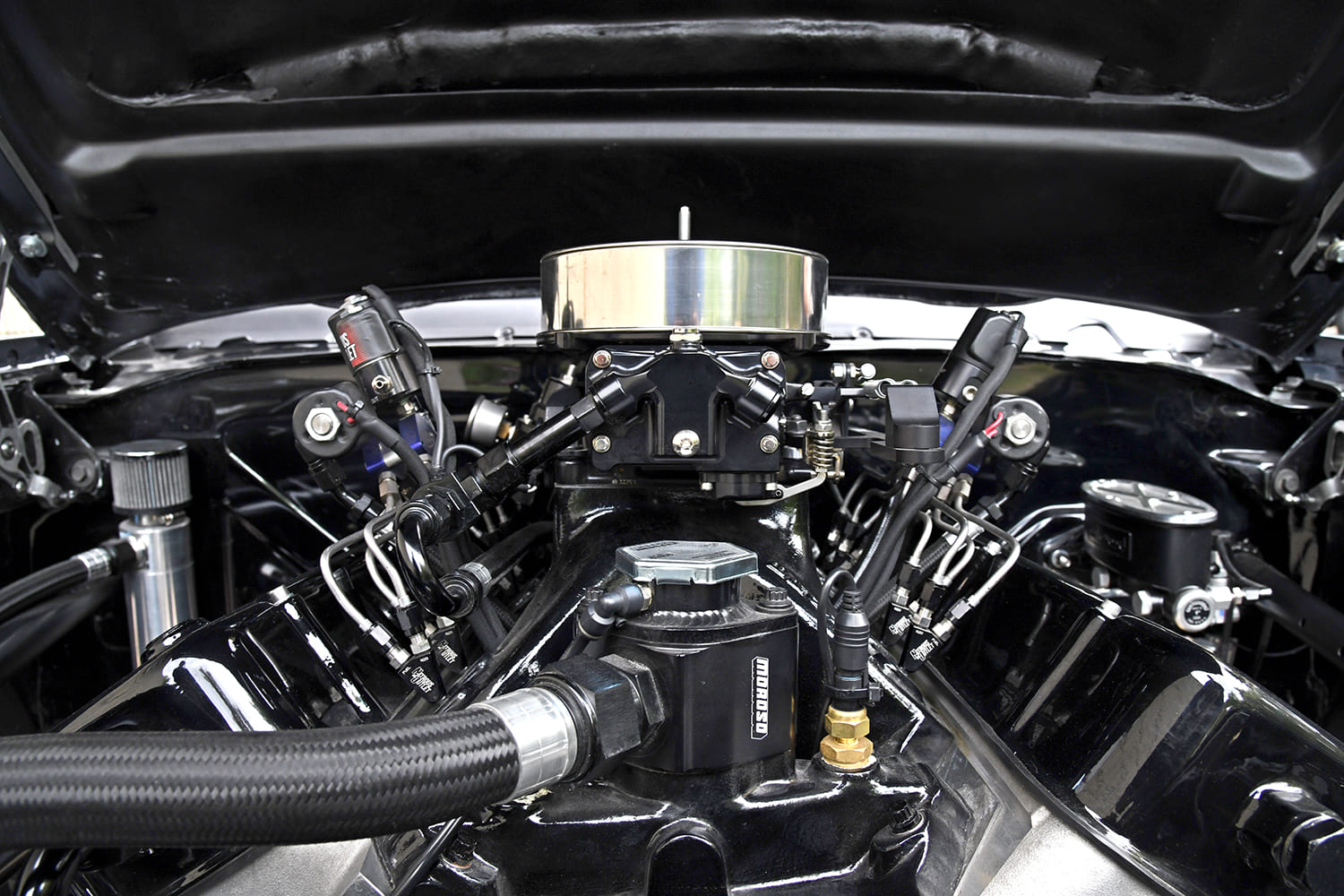 A Meziere Enterprises water pump and a Ron Davis aluminum radiator keep it all cool while custom 2.25-inch stainless steel headers expel spent gases through a 4-inch aluminum exhaust system and a set of Borla mufflers. A Clear View Filtration assembly lets the owner check the oil for any issues that arise.