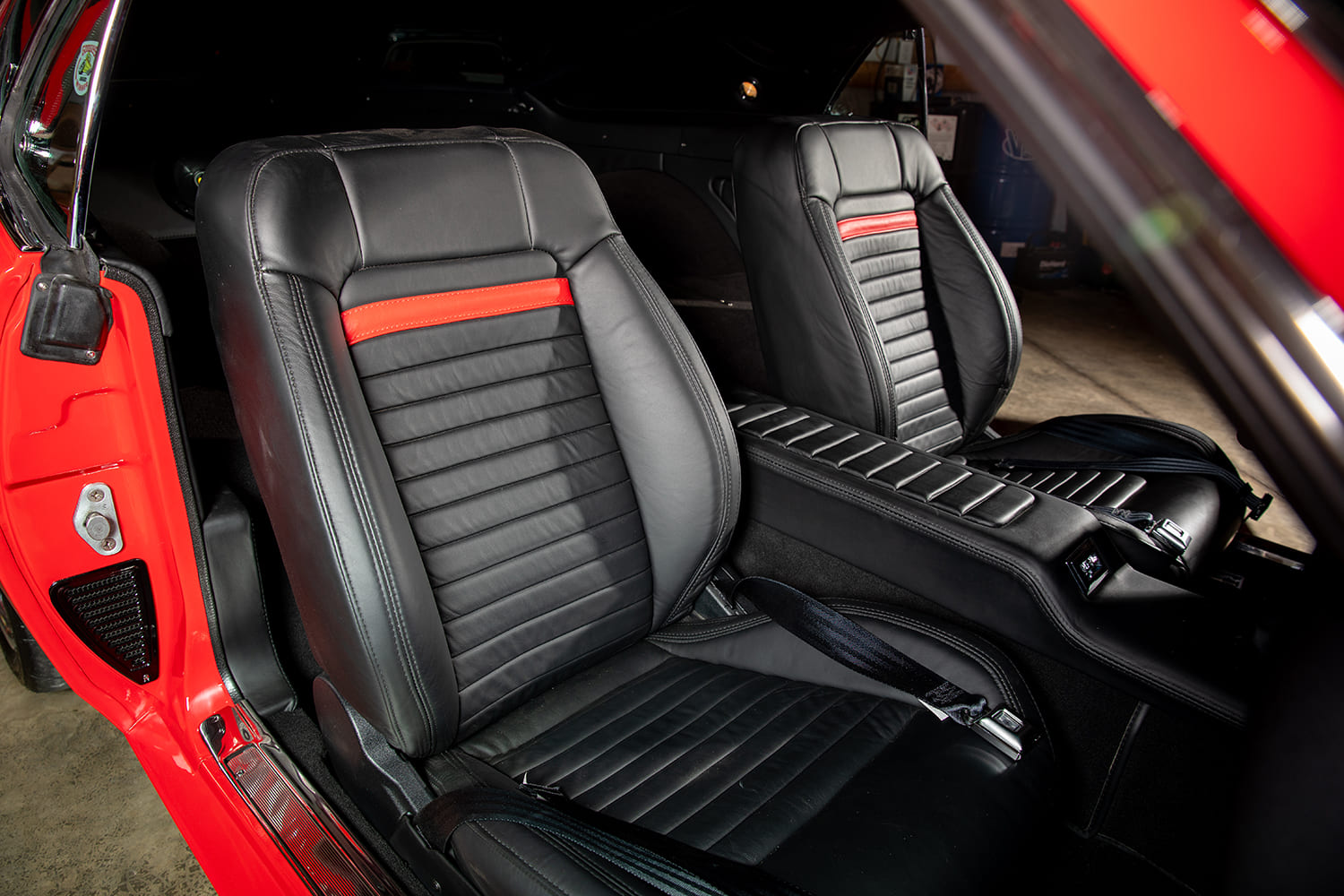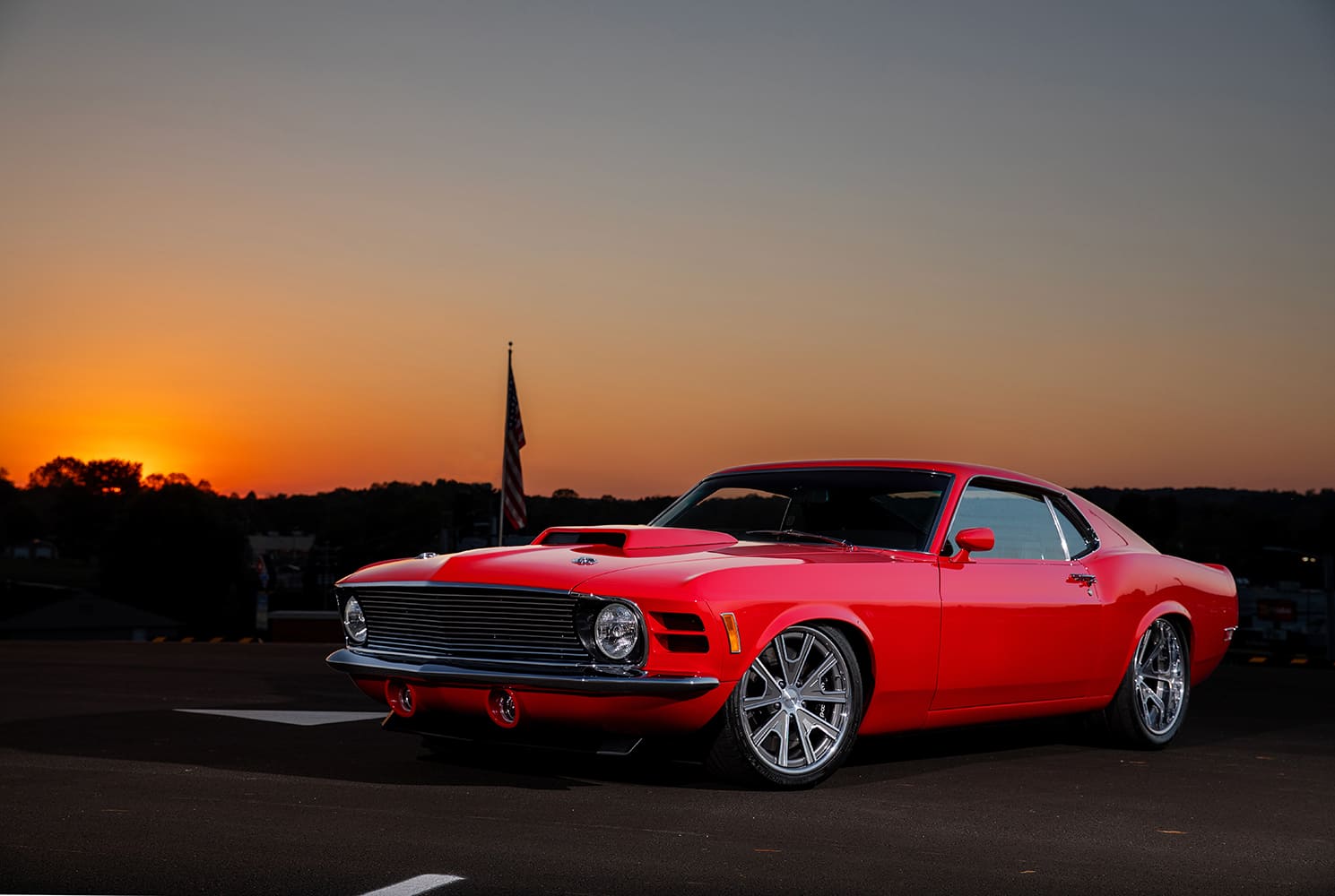 On the aesthetic side, the Mach 1 wears a brilliant coat of Colorado Red PPG paint, executed perfectly by Clayton and Joe Bond. The car’s exterior features a subtle yet aggressive custom front splash pan, tucked rear bumper, custom grille, and a hand-fabricated hood scoop that adds an edge to its classic lines. Rolling on Forgeline Grudge wheels—18×9 in the front and 19×12 in the rear, wrapped in Michelin (255/35-18 front) and Nitto (345/30-19 rear) tires—the overall stance commands attention. Rolling stock consists of Forgeline Grudge wheels—18×9 up front, 19×12 in the rear.