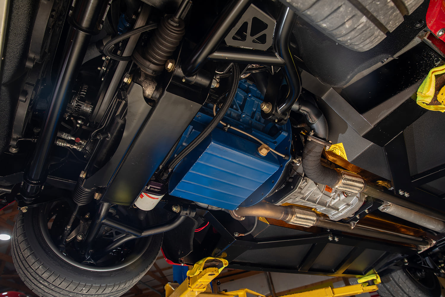 The power underhood comes from a Gen 1 Ford Coyote crate engine, which Kenny sent to Kennedy Performance to have its bore enlarged and filled with Manley forged internals. Paired with a Whipple 2.9L supercharger and a massive 132mm throttle body, this setup produces an impressive 800hp and 650 lb-ft of torque at the tires. It’s tuned via Ford’s Control Pack and fueled by a Deatschwerks 810-LPH pump. The fans and radiator are custom PRC units, along with an air-to-water intercooler and Bosch pump. Managed by a TREMEC Magnum six-speed transmission from American Powertrain, this beast is supported by a sturdy Strange Engineering 9-inch rearend with 3.89 gears and a Truetrac-equipped differential. Wilwood pedals handle the footwork, along with six-piston front and four-piston rear brakes that bring it all to a stop. Kenny was adamant about not having anything below the framerails, so he added the Wilwood electric parking brake. Kenny routed the brake lines through the rocker panels and the fuel lines inside the car. Bond’s Body Shop did most of the fabrication work. Kenny and his son, Blake, handled the drivetrain. The Coyote is a wonderfully fun powerplant, but it’s big. “We just barely got it to fit,” Kenny says. “There’s about ½ inch of room everywhere around it.”