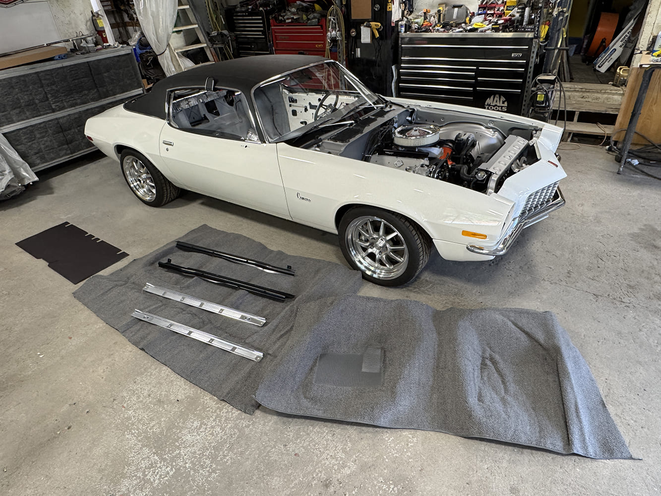 To prepare for installation, the outer perimeter of the inner headliner material was given a spray coating of HH-66 Vinyl Cement. It was also sprayed on the inner front and rear headliner retainer strips as well as the sail panel areas.Starting at the front, begin the installation of the headliner by carefully snapping the headliner bow into each individual bow clip, moving from center outward on each.For ease of installation, O’Brien trimmed the bow pocket material from each row while proceeding using a standard screwdriver to help snap each bow into the clips.Here you can see the base of the headliner installation completed now that the bows have all been snapped into place.O’Brien then set the front headliner retaining strip (PN C95250) in place. Note there is a coating of previously applied HH-66 Vinyl Cement on the inner surface both front and rear.Out back, follow by installing the rear reproduction stamped steel headliner retaining strip.The excess headliner material was carefully trimmed on both the driver and passenger side.To complete the job, a headliner installation tucking tool (PN A7672) was used both front and rear to gracefully stretch and tuck the headliner material into the retainer strips while moving from left to right while tucking. Note, that a coating of HH-66 Vinyl Cement was previously sprayed on the inner headliner surface on each end.The freshly installed headliner looks awesome, accented by a new reproduction dome lamp set (PN R358).To prepare for the carpet, a new set of reproduction stamped steel body sill plate wiring harness carpet guards from Classic Industries (PN K892990) were set in place on both the driver and passenger sides.To prepare for carpeting, the cabin was vacuumed clean followed by a wipe down with a damp cloth to remove any remaining dust. An OER two-piece molded carpet set in Gunmetal Gray from Classic Industries (PN K219035) was unboxed to relax to its form. Here is the rear section set in place.With the rear carpet section settled in place it was time to address fitment, starting with locating areas that needed to have access holes cut. Starting with cutting access for the center console mounts using a razor, O’Brien followed with locating the seatbelt mounting bolts, which were loosely installed prior to the carpet being laid in place.The console mounting bracket was then brought through the carpet opening.Next, the rear seat mounting brackets (2) were located and trimmed using a razor blade.The carpet set is extra wide at the sill plate area allowing it to be custom trimmed to suit the application.The REM Automotive reproduction rear seat trunk partition divider from Classic Industries (PN K15700) was then set in place.O’Brien followed by sliding the OEM-style die-cut reproduction rear seat shelf package tray (PN F3821001) into place.The front carpet section was then set in place and adjusted for proper fitment.To allow access for the shifter, the boot and handle were first removed to determine the size hole needed. A razor was used to cut the opening, allowing for perfect placement of the carpet.With any area requiring a little finessing to achieve the perfect form, a heat gun was used along with any needed relief cuts.The icing. O’Brien installed new OER stamped aluminum doorsill plates (PNs 9819034 and 9819033) from Classic Industries.The completed carpet and headliner installation was completed with basic hand tools and looks amazing. Stay tuned for our next installment when the final interior hits the business office.