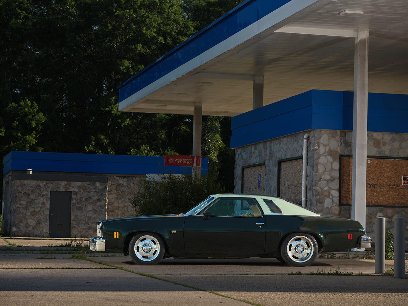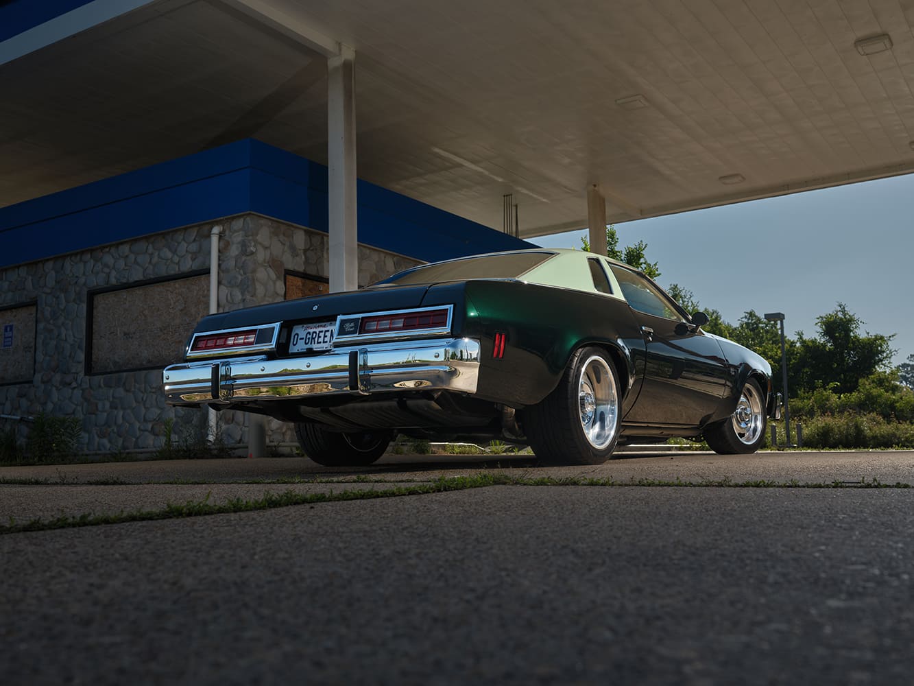 The exterior speaks softly but carries a big stick. Nobody Customs handled the bodywork and sprayed the car in a stunning coat of PPG Forest Green—an elegant and classic choice original to the car that complements the Malibu’s clean lines. The grille, bumpers, and taillights remain stock, but the polished chrome and Holley RetroBright headlights add a modern touch to the car’s original intentions.