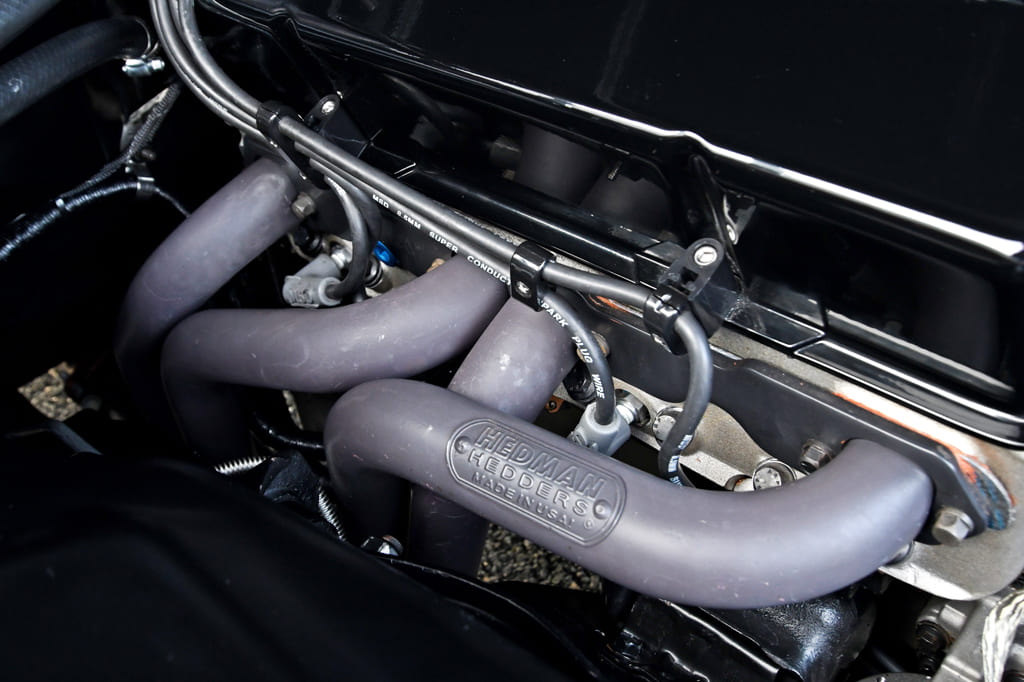 Exhaust: Headman Hedders long-tube headers to 3-inch exhaust with X-pipe over rear axle