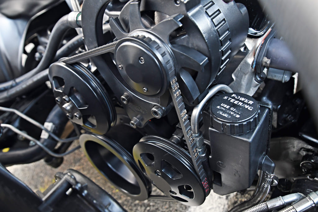 Ancillaries: Eddie Motorsports Billet V Drive V-Belt pulley system, valve covers, and hood hinges