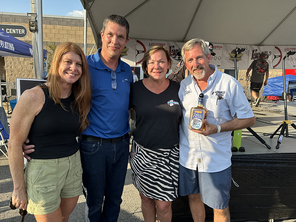 Presented to Steve Tracy (right) and his wife, Sheri, for their tireless effort on the amazing TCR trophies and guitars, is a Triple Crown bottle of whiskey presented by Mark and Jessi Bowler (left) of Bowler Performance Transmissions. It was autographed by the likes of Mike and Jim Ring, Chip Foose, Roy Brizio, Johnathan Goolsby, Troy Trepanier, Troy Ladd, Andy Leach, and Phil and Jeremy Gerber.
