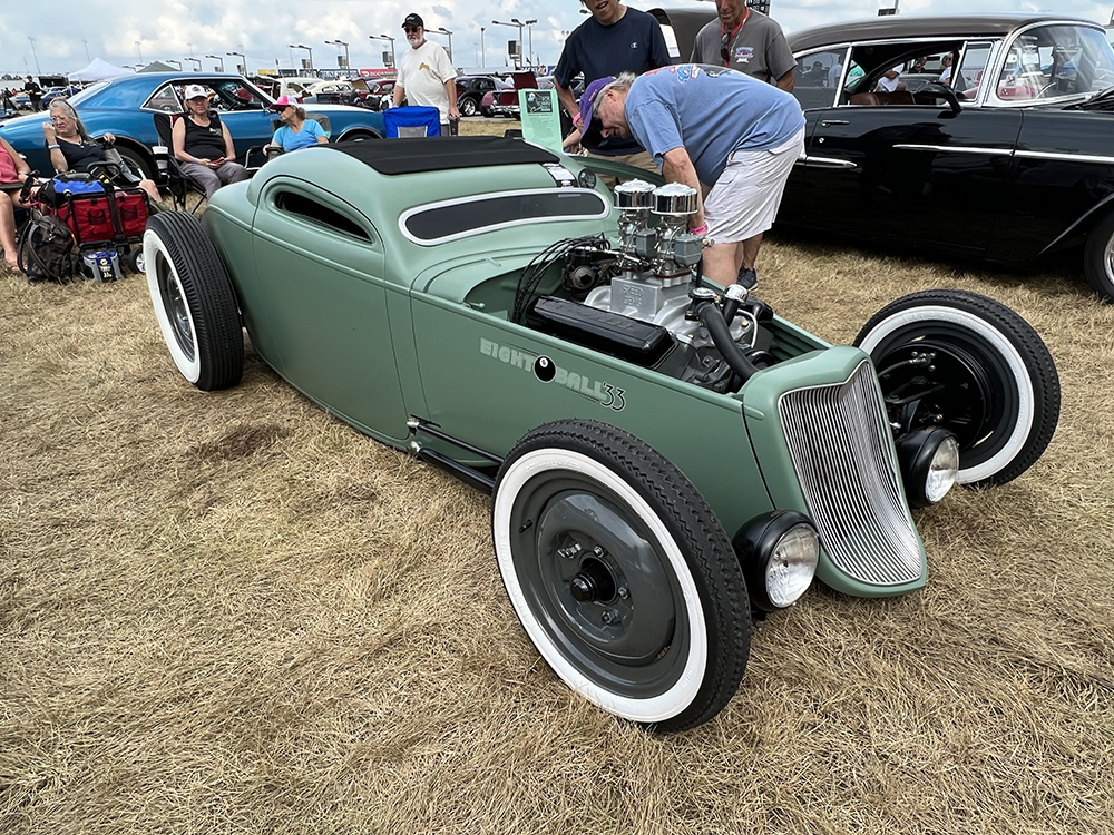 Keith and Jody Hill from Broken Arrow, OK, were on hand with their ’33 Ford fenderless three-window coupe. It brought home a Jesse Greening of Greening Auto Company Builder’s Pick as well as a CPP-sponsored Top 30 award. Chrysler Fire Power Hemi equipped with four Stromberg 97 carbs for power.