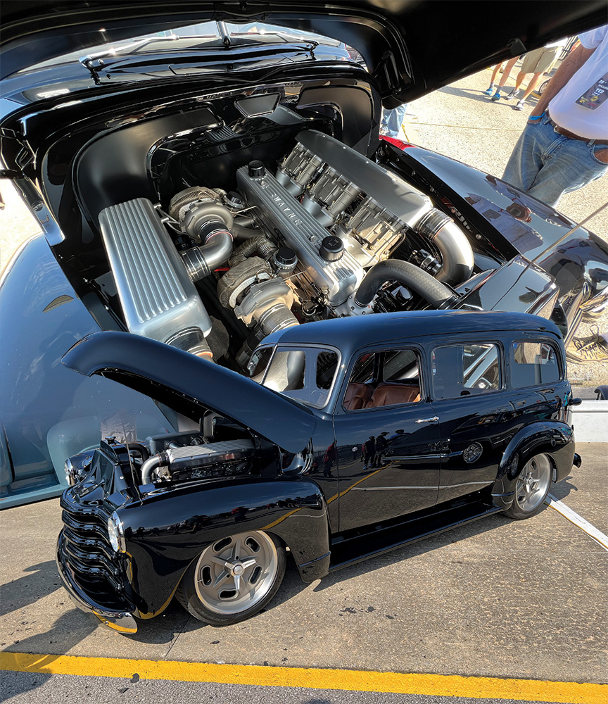 Another of the CPP-sponsored Elite 10 is this ’52 Suburban belonging to David Pilgram of Rockport, TX. How about a Chevy six-cylinder motor with a Wayne head, twin turbocharged, and a triple play of Borla EFI throttle bodies adapted to the Stovebolt for power.