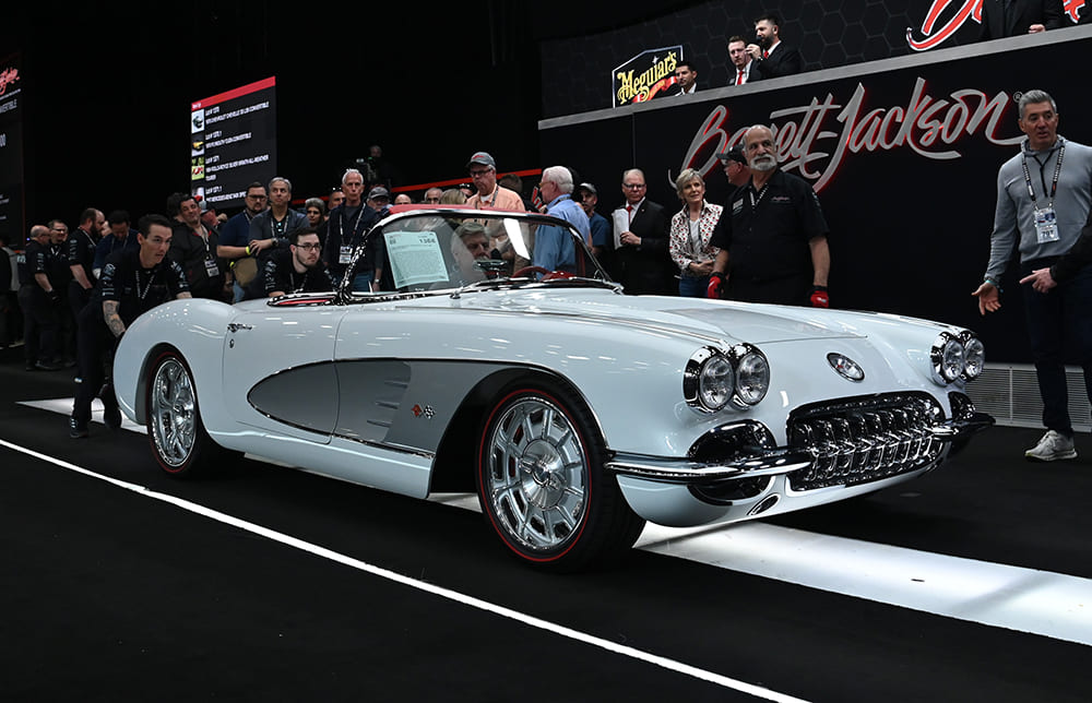 Corvettes are always in the “desirable” ranks, and another top-dollar getting “restomod” was this BASF Pearl White ’58 Corvette (Lot #1368) that brought home $558,500. Powered by an LS7, it rides on an Art Morrison Enterprises fully independent chassis and shows off its custom Schott wheels.