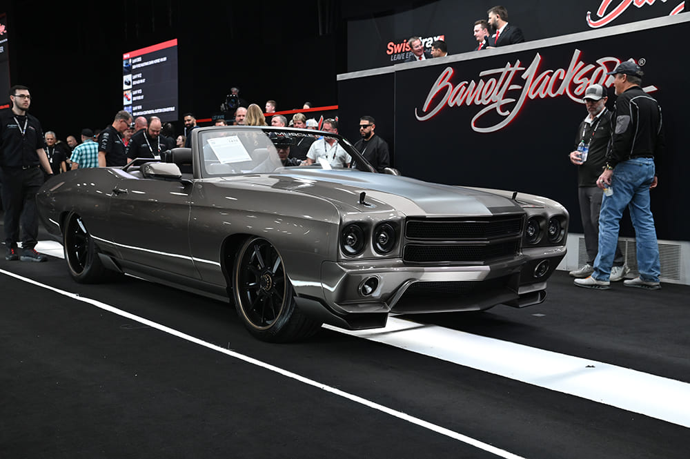 One more Corvette to bring top dollar was this custom ’58 convertible (Lot #1348) with an auction sale of $550,000. Once again, an Art Morrison Enterprises fully independent chassis riding on one-off wheels is powered by an LT1, painted with PPG Sky Fall color with the side coves in a Silver Mist.