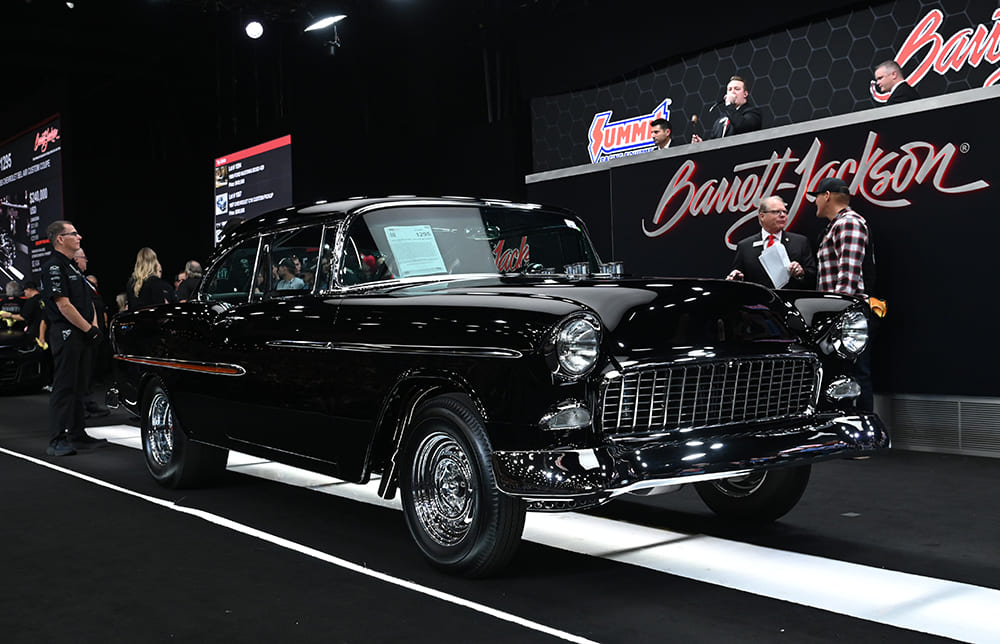Never doubt the value of a ’55 Chevy (Lot #1295). Here, a gasser-style build in the vein of the American Graffiti Tri-Five features a Hilborn-injected small-block that brought a sale price of $330,000.