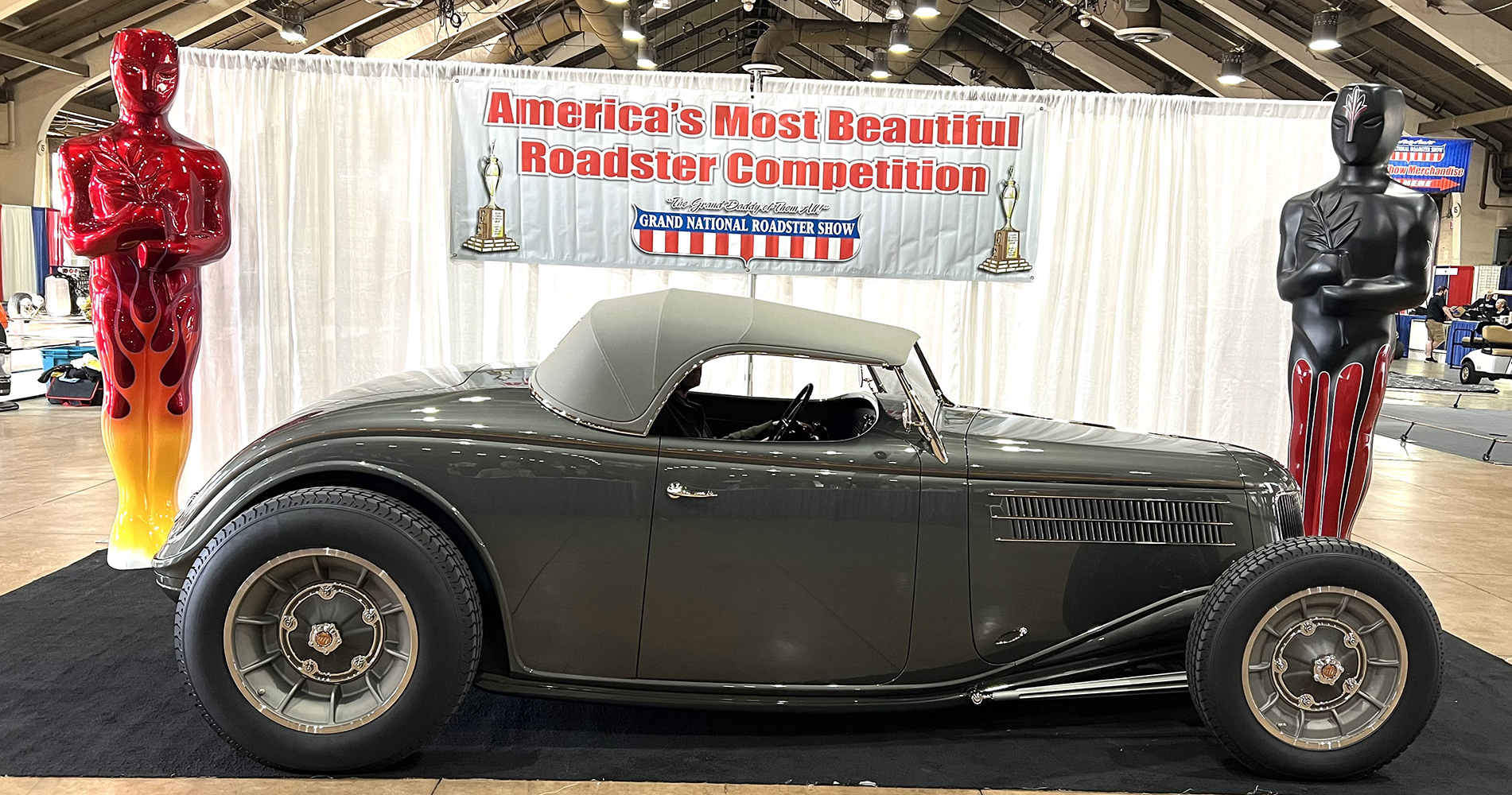 The perpetual 9-foot plus trophy representing America’s Most Beautiful Roadster sponsored by ARP was awarded this year to the 1936 Ford fenderless roadster owned by Ross and Beth Myers. The roadster was also awarded Outstanding Display.