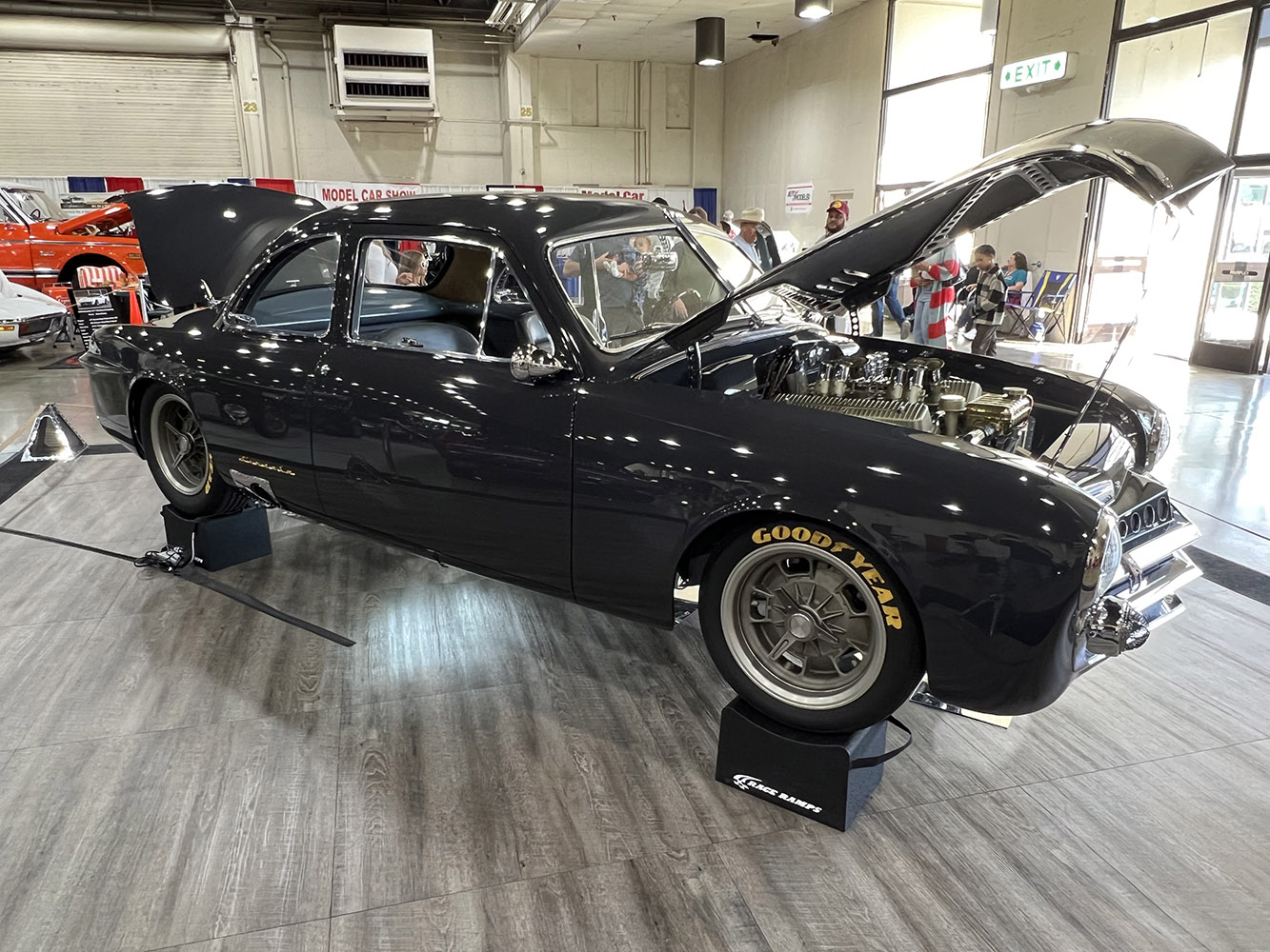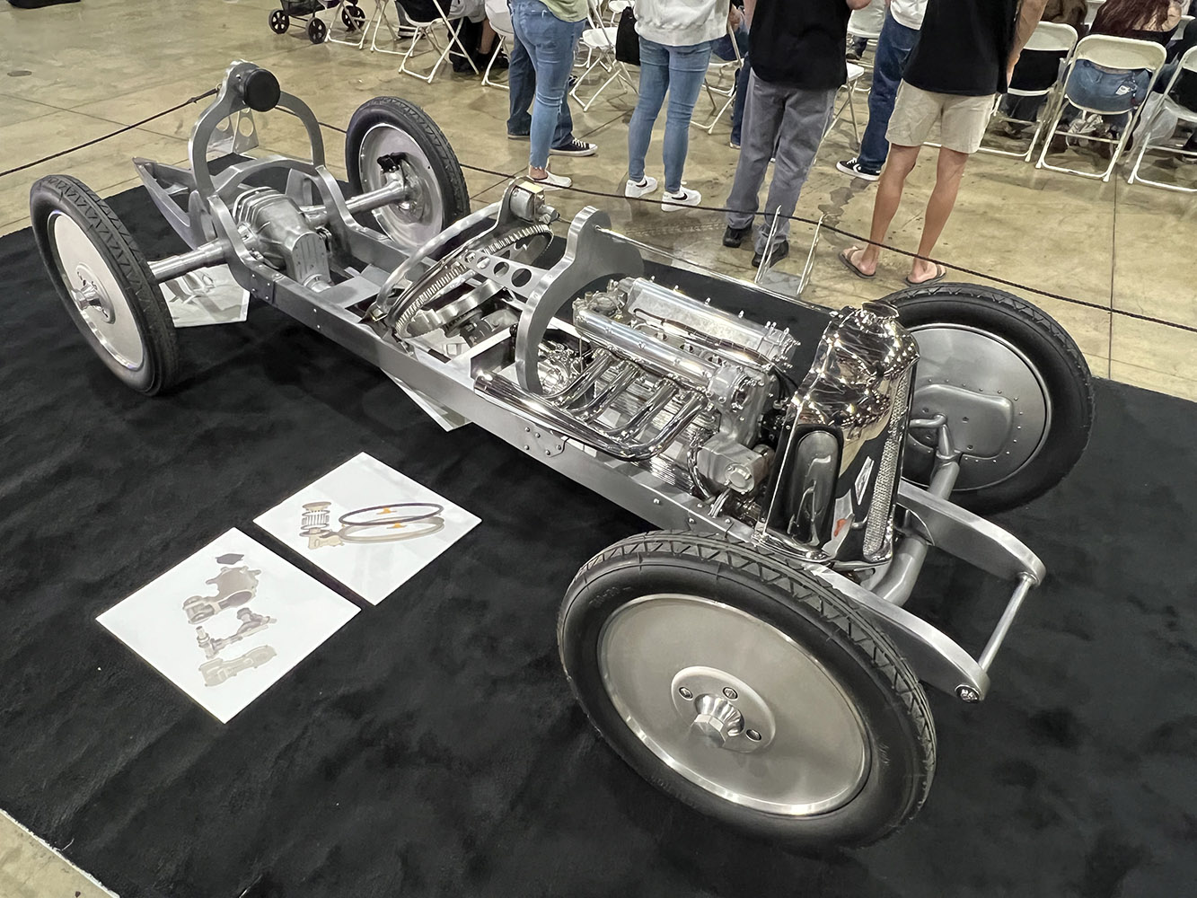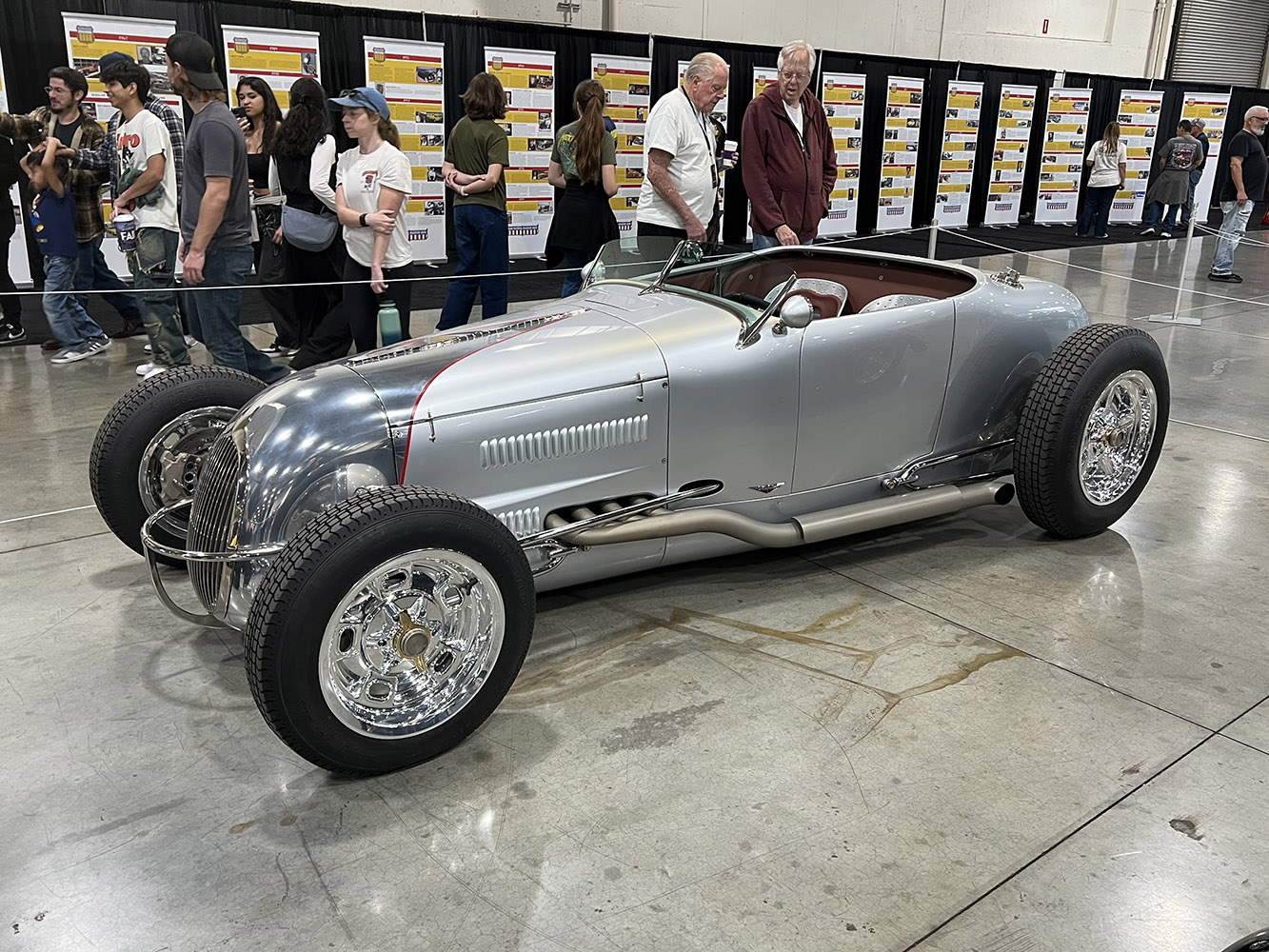 We found this interesting in metal finish fenderless hot rod at the Hollywood Hot Rods booth.