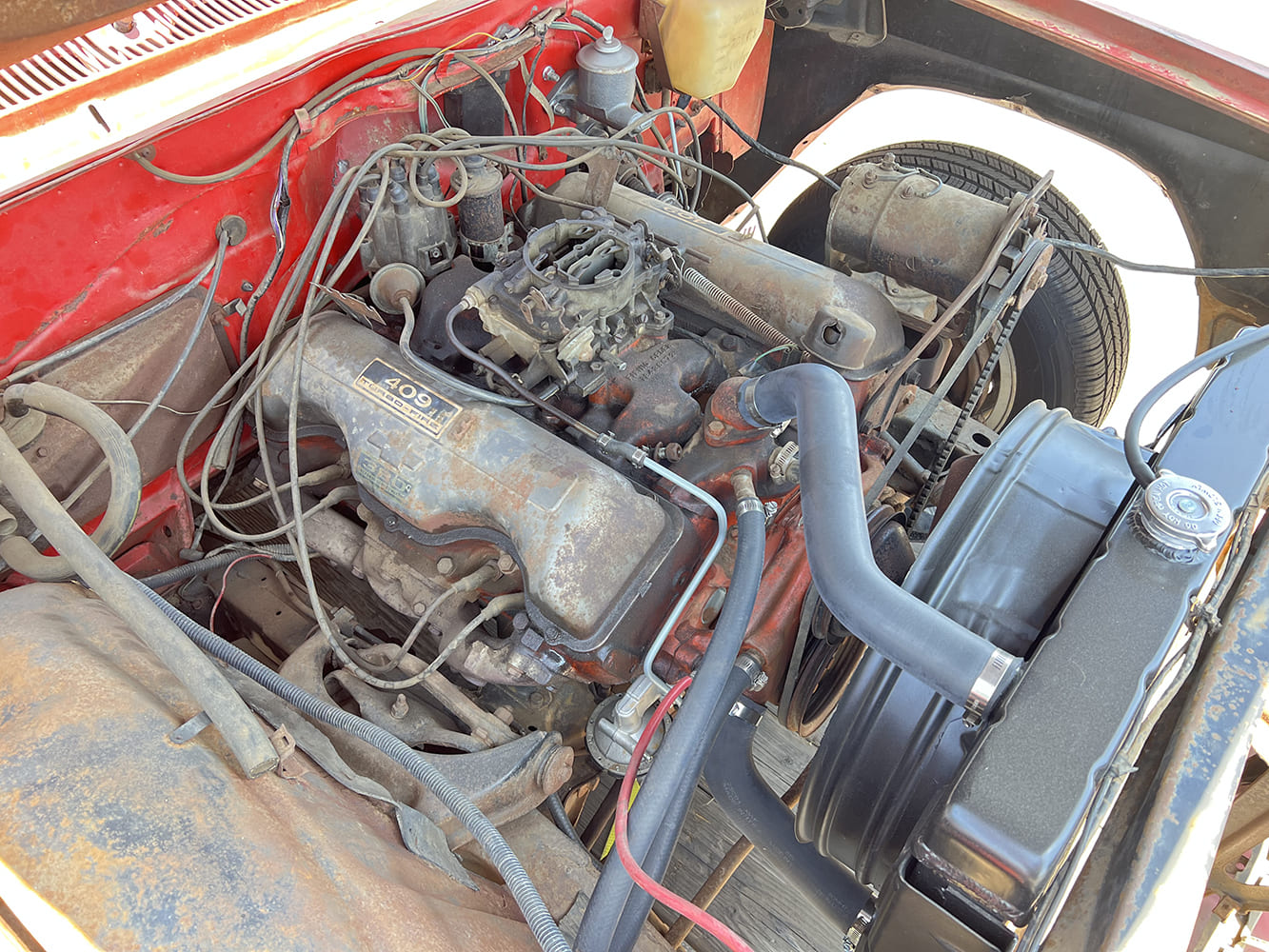 This 409 features valve covers indicating 380 hp, signifying it is the 1962 variant. The dual four-barrel edition of the “Ought Nine” was rated at 409 hp.