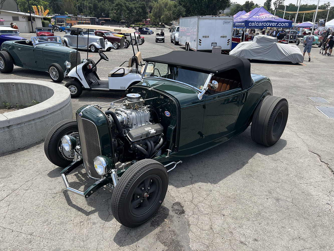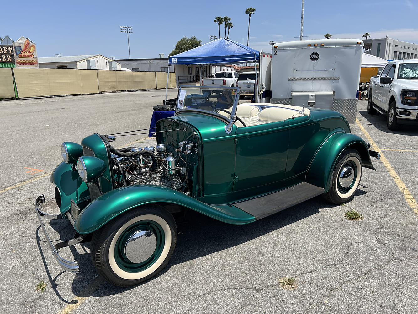 Ralph Castor (Aces Car Club) of Modjeska Canyon in SoCal drove his metal-finished 1932 Ford highboy roadster, featuring 1939 Ford teardrop taillights, a four-spoke Sprint Car–style wheel, Auto Meter gauges, and a hot rod steering column; no tilt here.