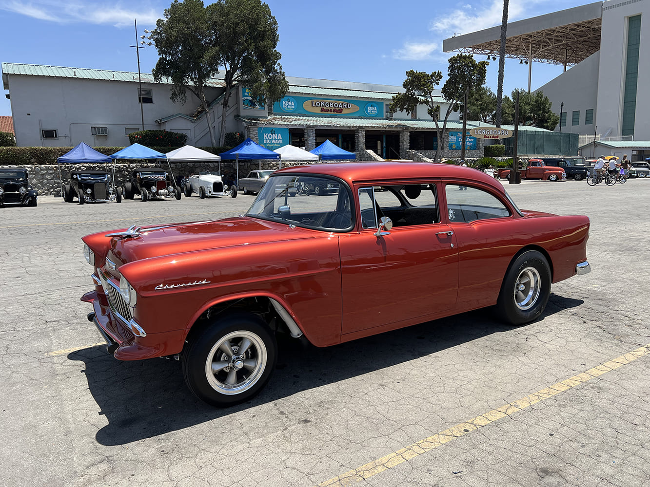 The gasser look, complete with radiused rear wheelwells, always works on a 1955 Chevy. Inside, bucket seats, a rollbar, no rear seat, a dash-mounted tach, three pedals, and the traditional oversized throttle pedal carry the theme.