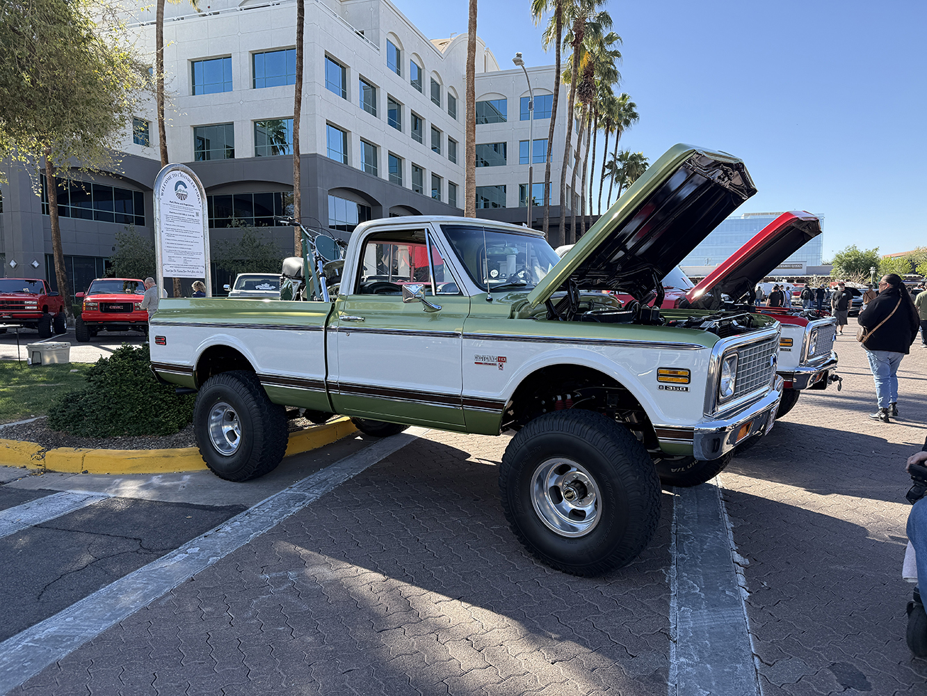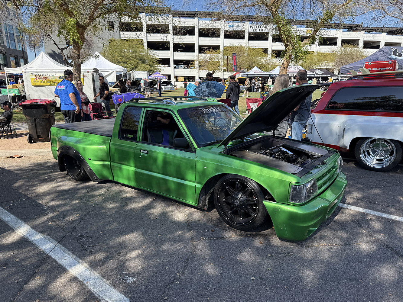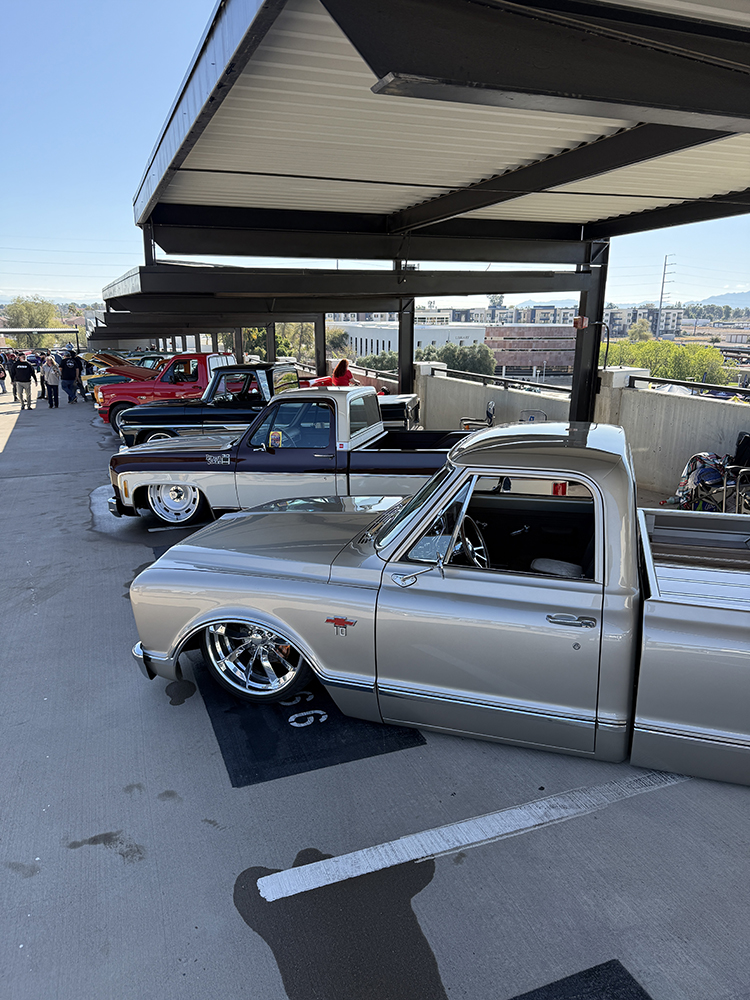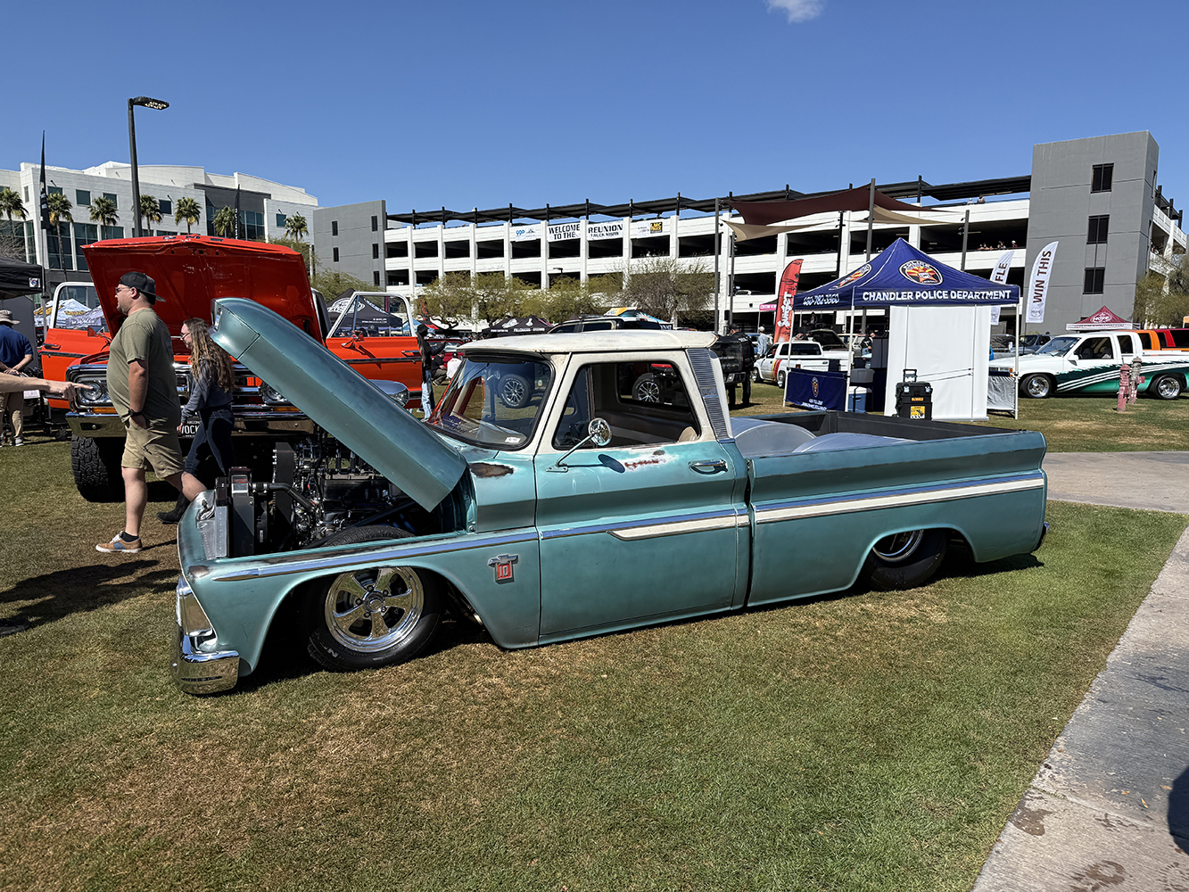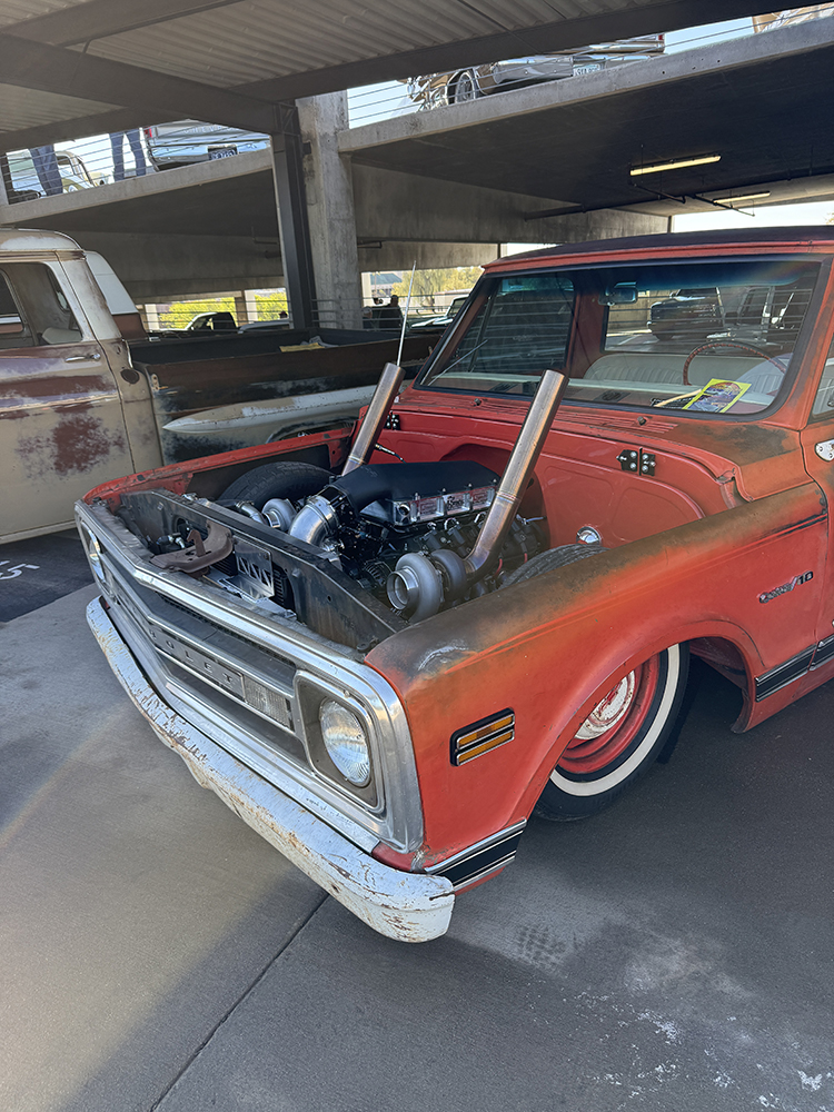 I strolled over from the San Marcos Inn (the extremely nighttime-noisy San Marcos Inn!) midway through the enormous line of trucks filing into the multi-level Downtown Chandler parking garage—hence the moniker “World’s Tallest Truck Show”—and the vendors finishing up their setup, which had been delayed for many due to the Plaza Lawn being soaked from the previous day’s rain storm. With the show sold out, the parking structure was literally filled top to bottom (top level reserved for specially chosen Upper Deck trucks), while the adjacent Dually Dr. and Four Wheel Way (so “re”named by the city!) were lined with just that: dualies and 4x4s/off-road classic trucks!