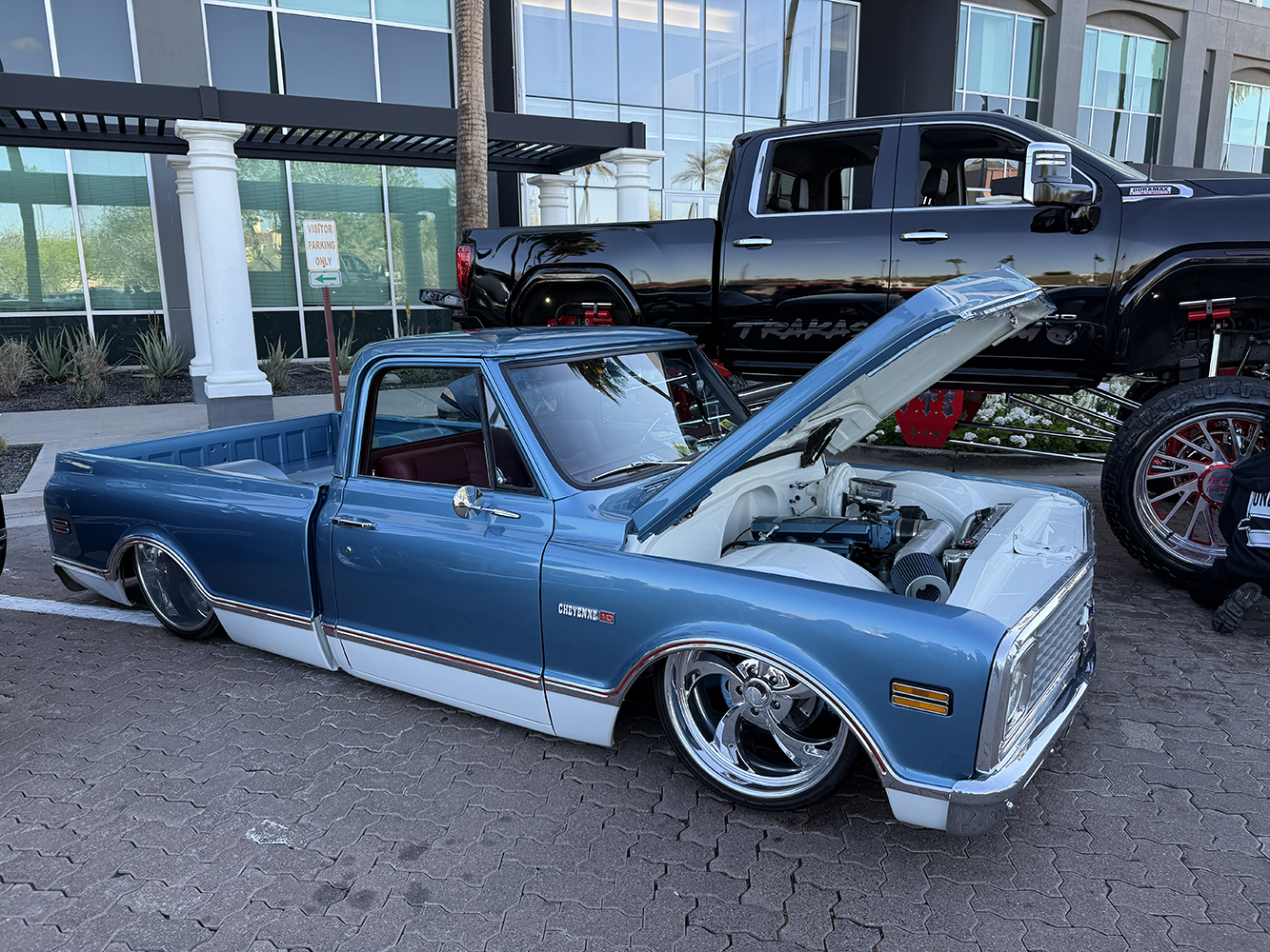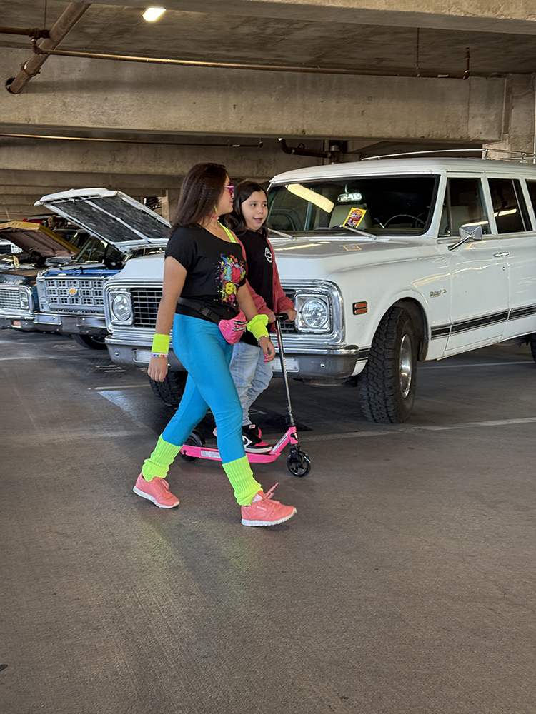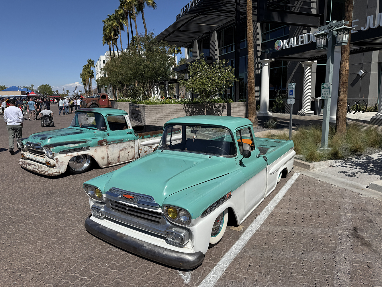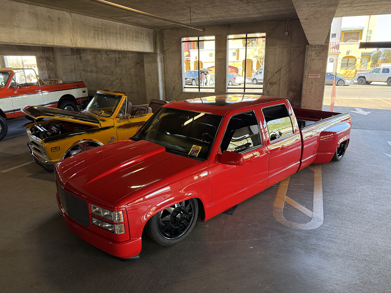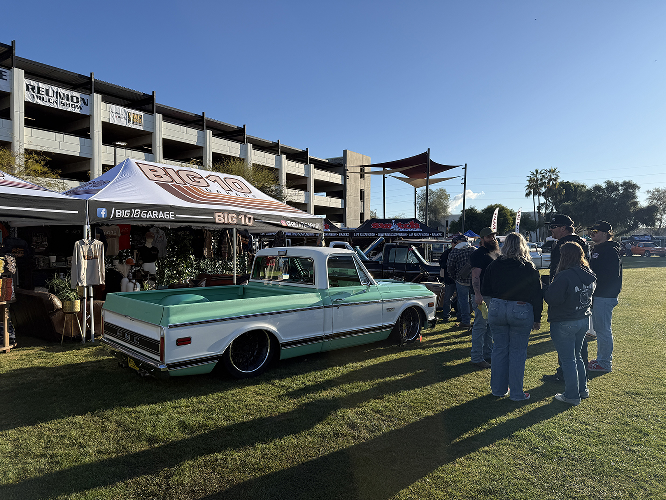 I strolled over from the San Marcos Inn (the extremely nighttime-noisy San Marcos Inn!) midway through the enormous line of trucks filing into the multi-level Downtown Chandler parking garage—hence the moniker “World’s Tallest Truck Show”—and the vendors finishing up their setup, which had been delayed for many due to the Plaza Lawn being soaked from the previous day’s rain storm. With the show sold out, the parking structure was literally filled top to bottom (top level reserved for specially chosen Upper Deck trucks), while the adjacent Dually Dr. and Four Wheel Way (so “re”named by the city!) were lined with just that: dualies and 4x4s/off-road classic trucks!