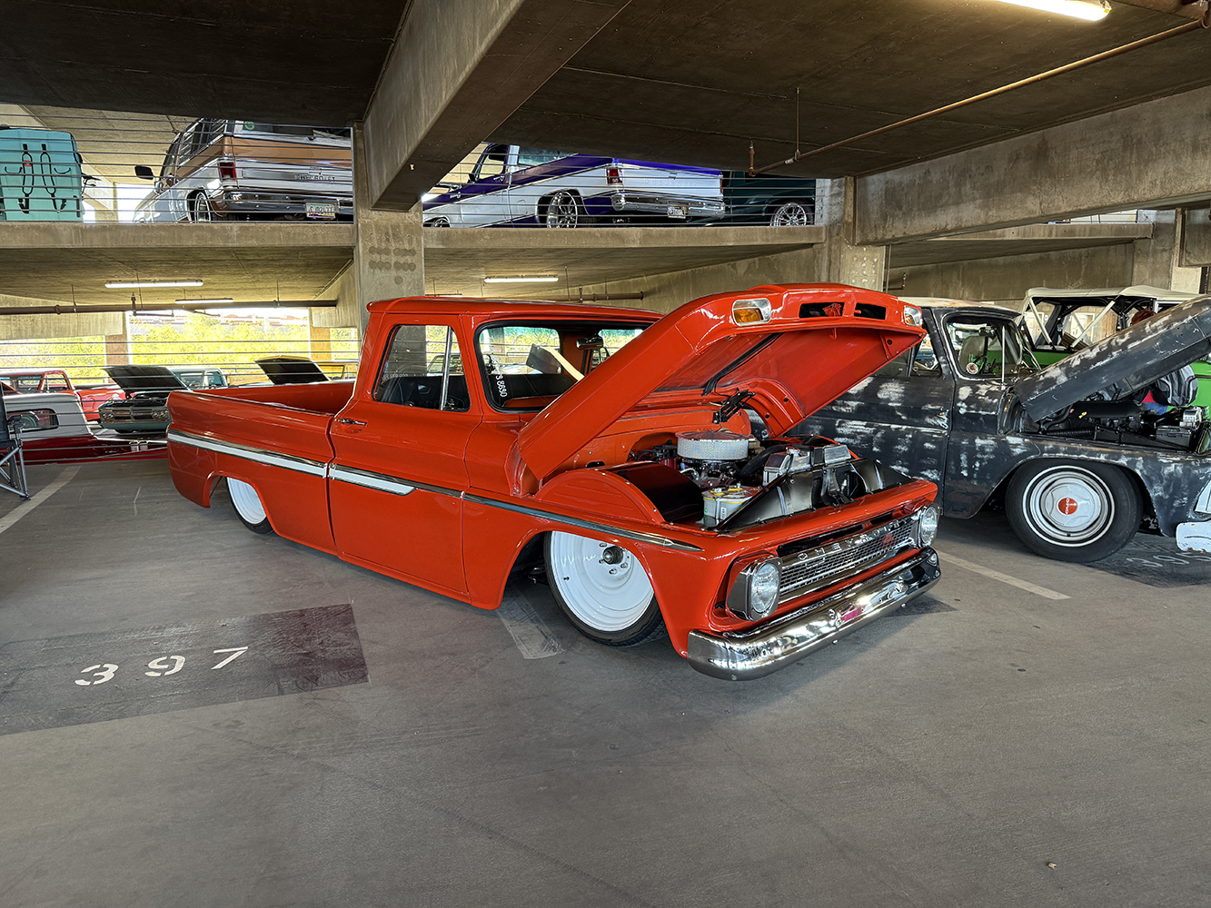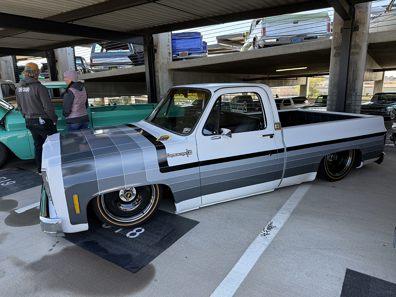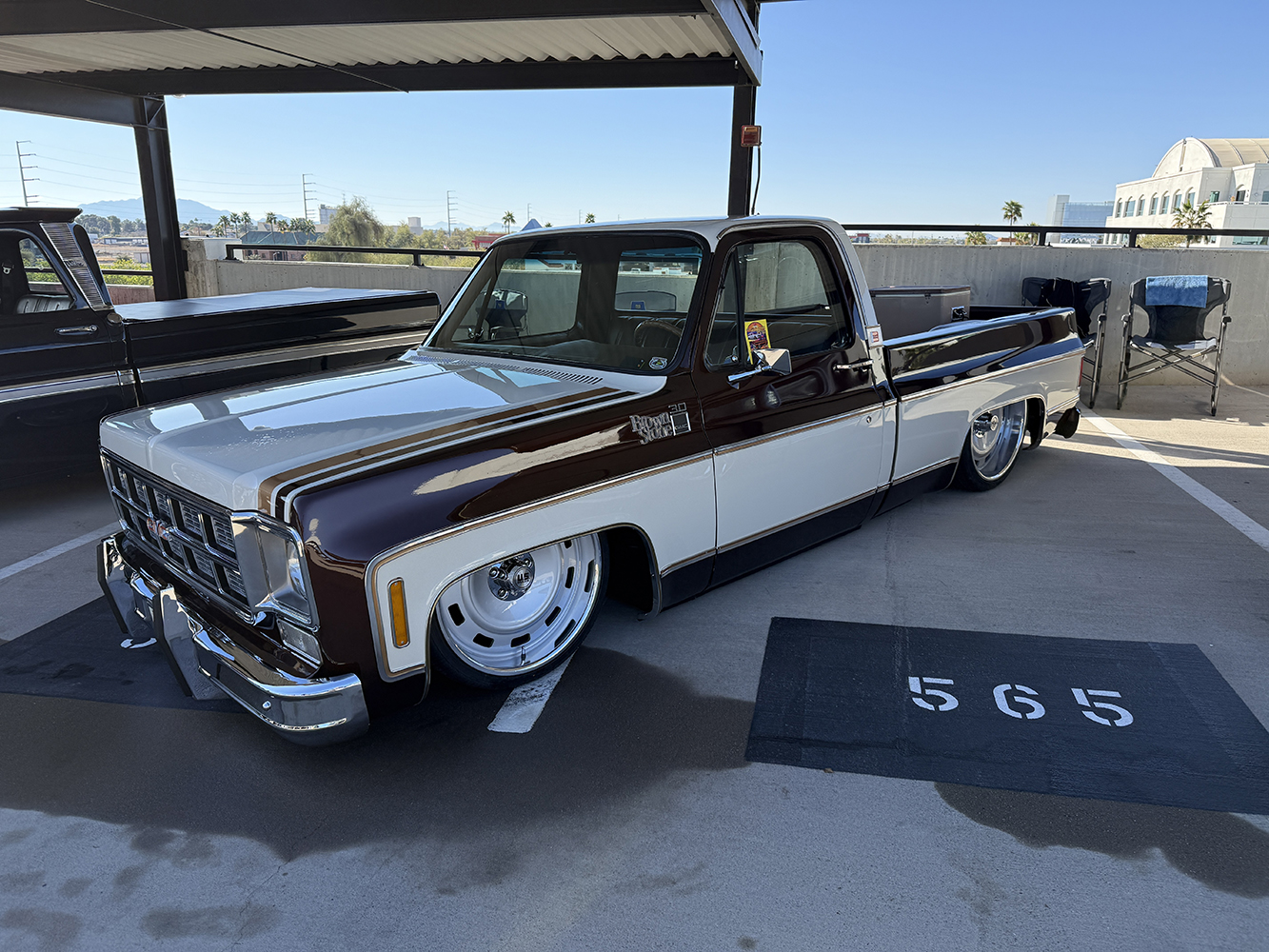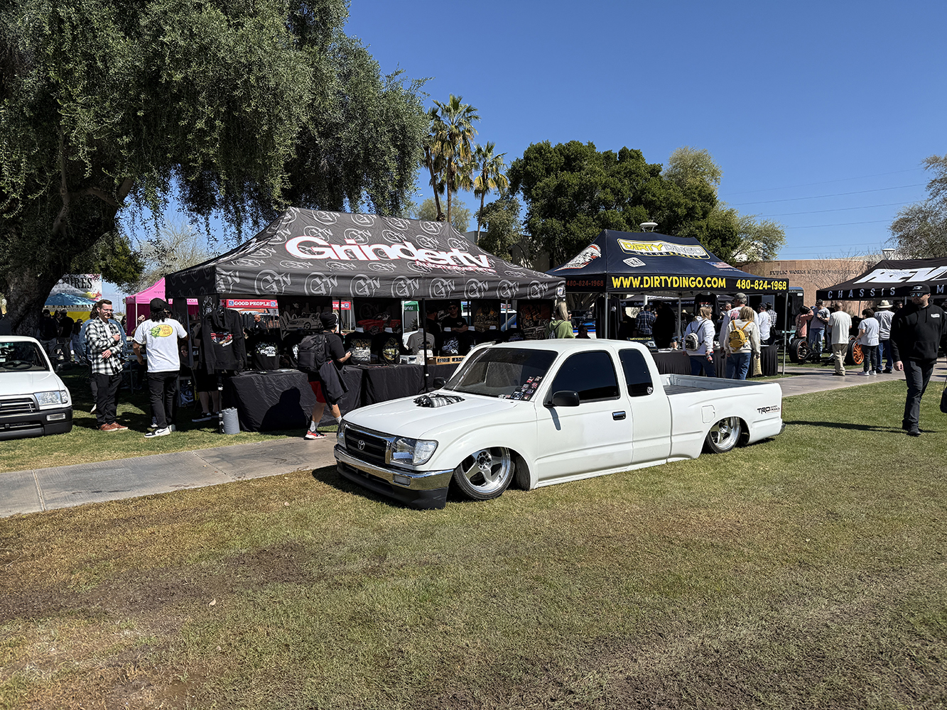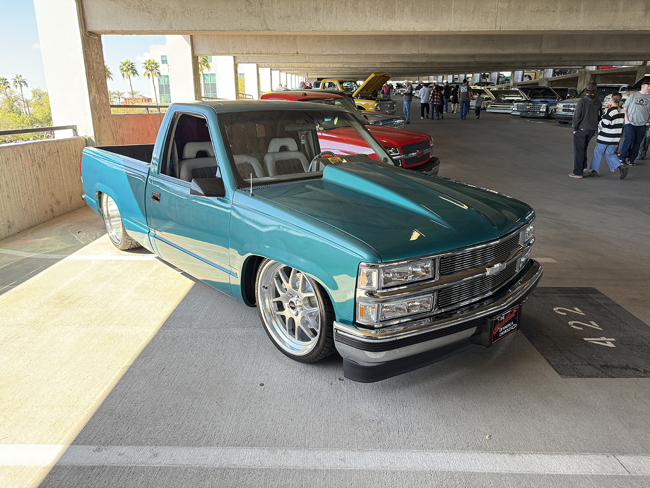 I strolled over from the San Marcos Inn (the extremely nighttime-noisy San Marcos Inn!) midway through the enormous line of trucks filing into the multi-level Downtown Chandler parking garage—hence the moniker “World’s Tallest Truck Show”—and the vendors finishing up their setup, which had been delayed for many due to the Plaza Lawn being soaked from the previous day’s rain storm. With the show sold out, the parking structure was literally filled top to bottom (top level reserved for specially chosen Upper Deck trucks), while the adjacent Dually Dr. and Four Wheel Way (so “re”named by the city!) were lined with just that: dualies and 4x4s/off-road classic trucks!