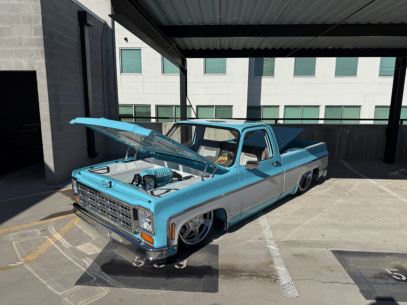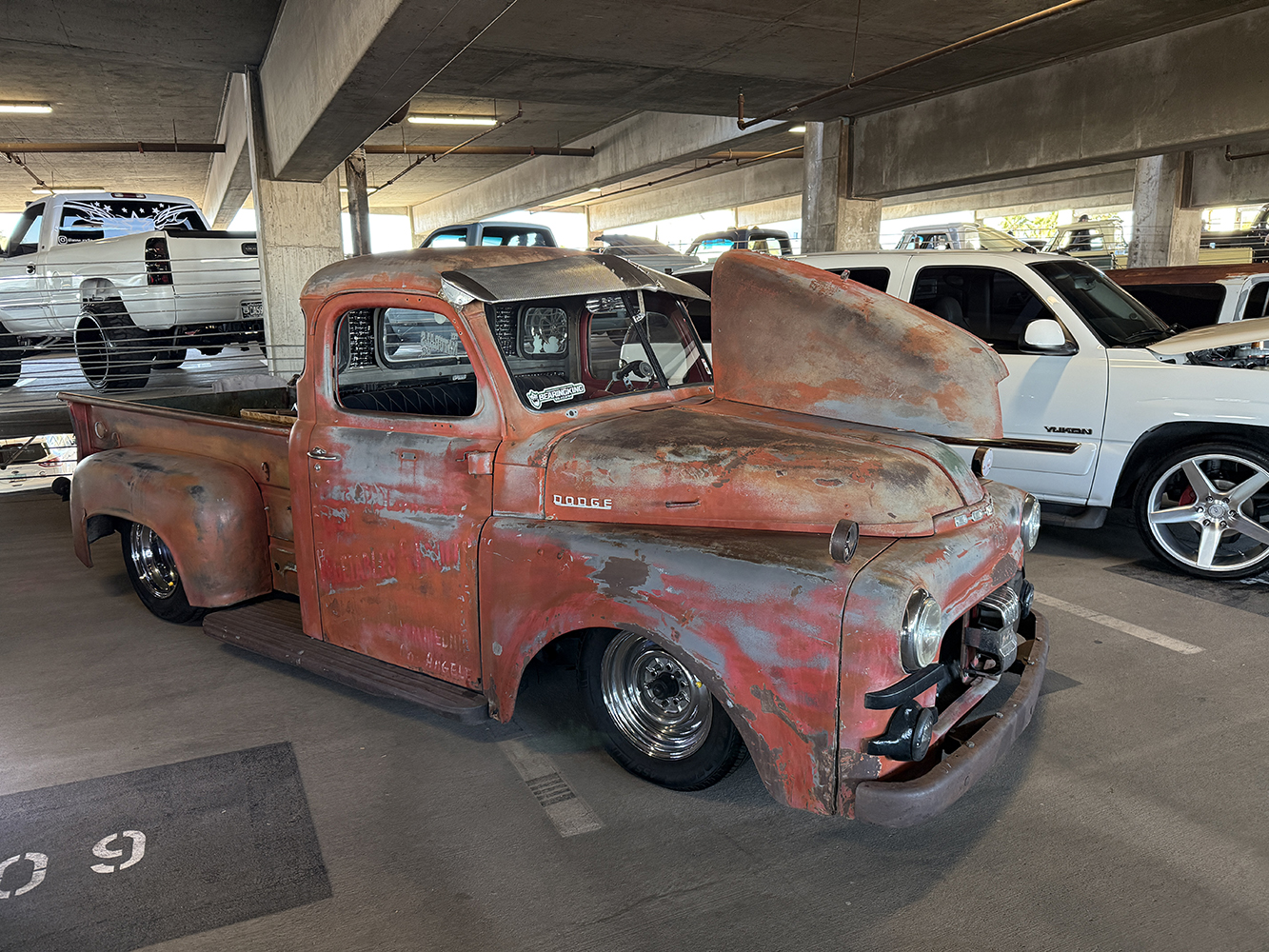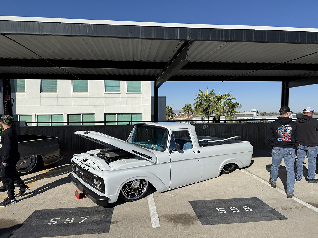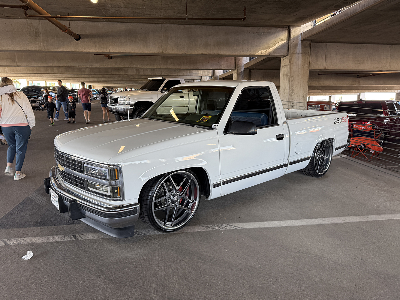 I strolled over from the San Marcos Inn (the extremely nighttime-noisy San Marcos Inn!) midway through the enormous line of trucks filing into the multi-level Downtown Chandler parking garage—hence the moniker “World’s Tallest Truck Show”—and the vendors finishing up their setup, which had been delayed for many due to the Plaza Lawn being soaked from the previous day’s rain storm. With the show sold out, the parking structure was literally filled top to bottom (top level reserved for specially chosen Upper Deck trucks), while the adjacent Dually Dr. and Four Wheel Way (so “re”named by the city!) were lined with just that: dualies and 4x4s/off-road classic trucks!