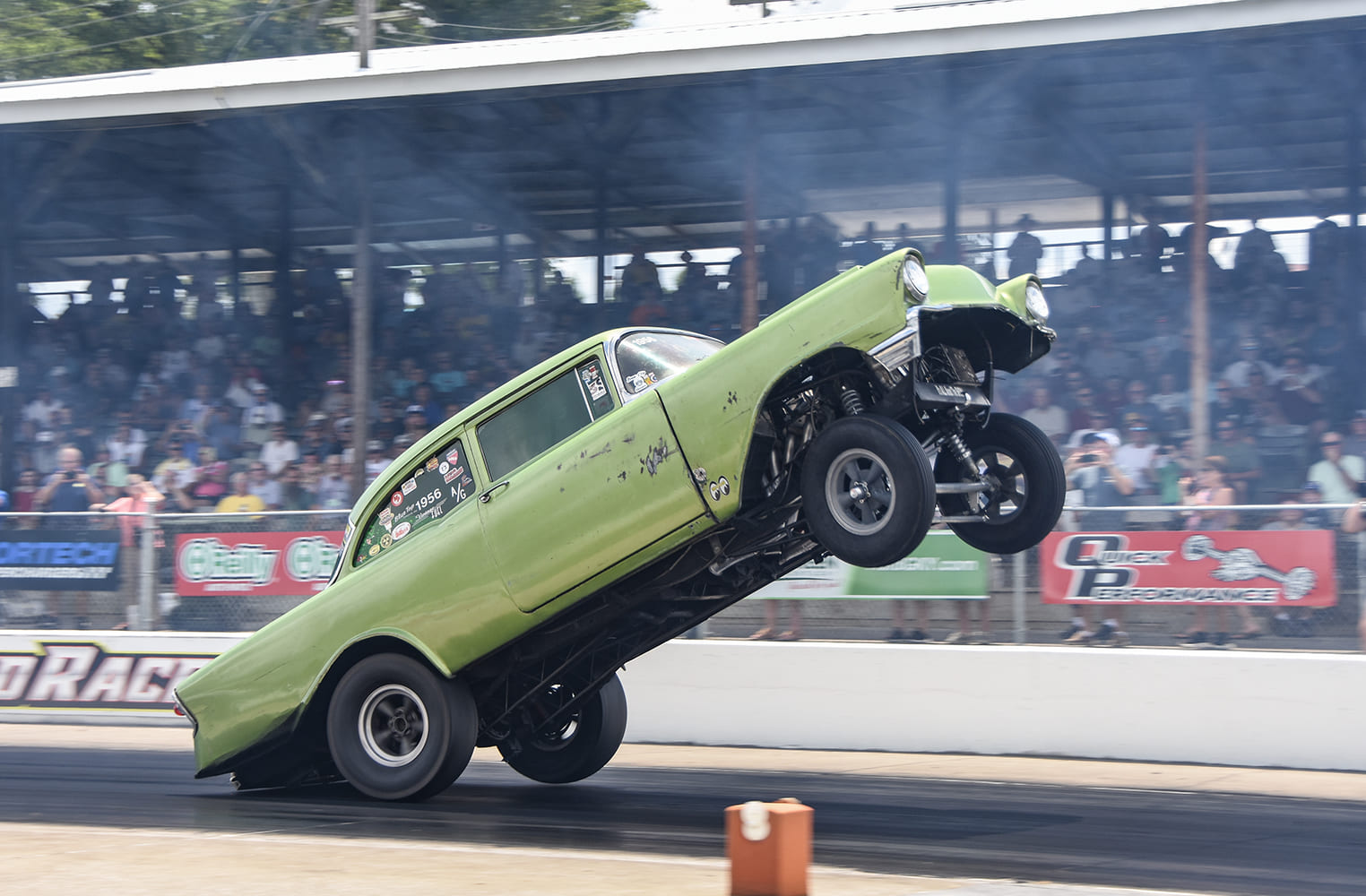 Burnouts are plentiful on the dragstrip, as peer pressure from thousands of like-minded enthusiasts offers just enough incentive to keep them lit up for longer than usual. This A/Gas prepared 1955 Chevy punishes its tires and pleases the crowd.
