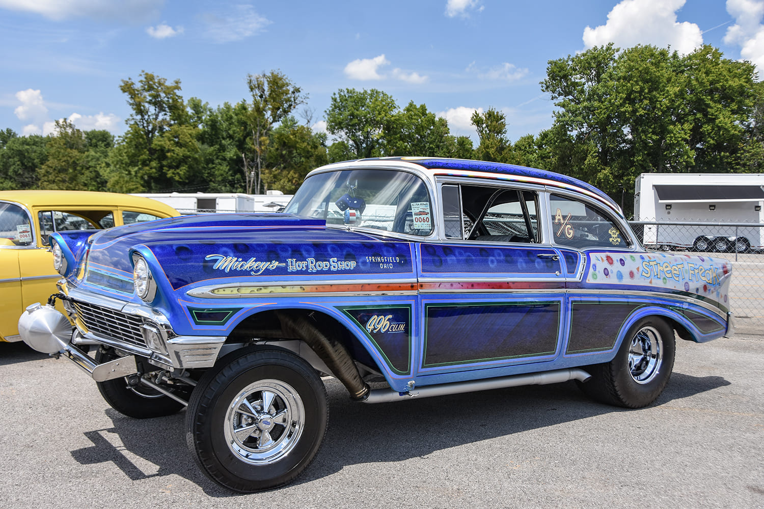 Mickey’s Speed Shop in Springfield, Ohio, is responsible for this wild 1956 Chevy named “Street Freak.” The psychedelic paintjob goes great with the nose-up gasser stance and Cragar S/S wheel combination.