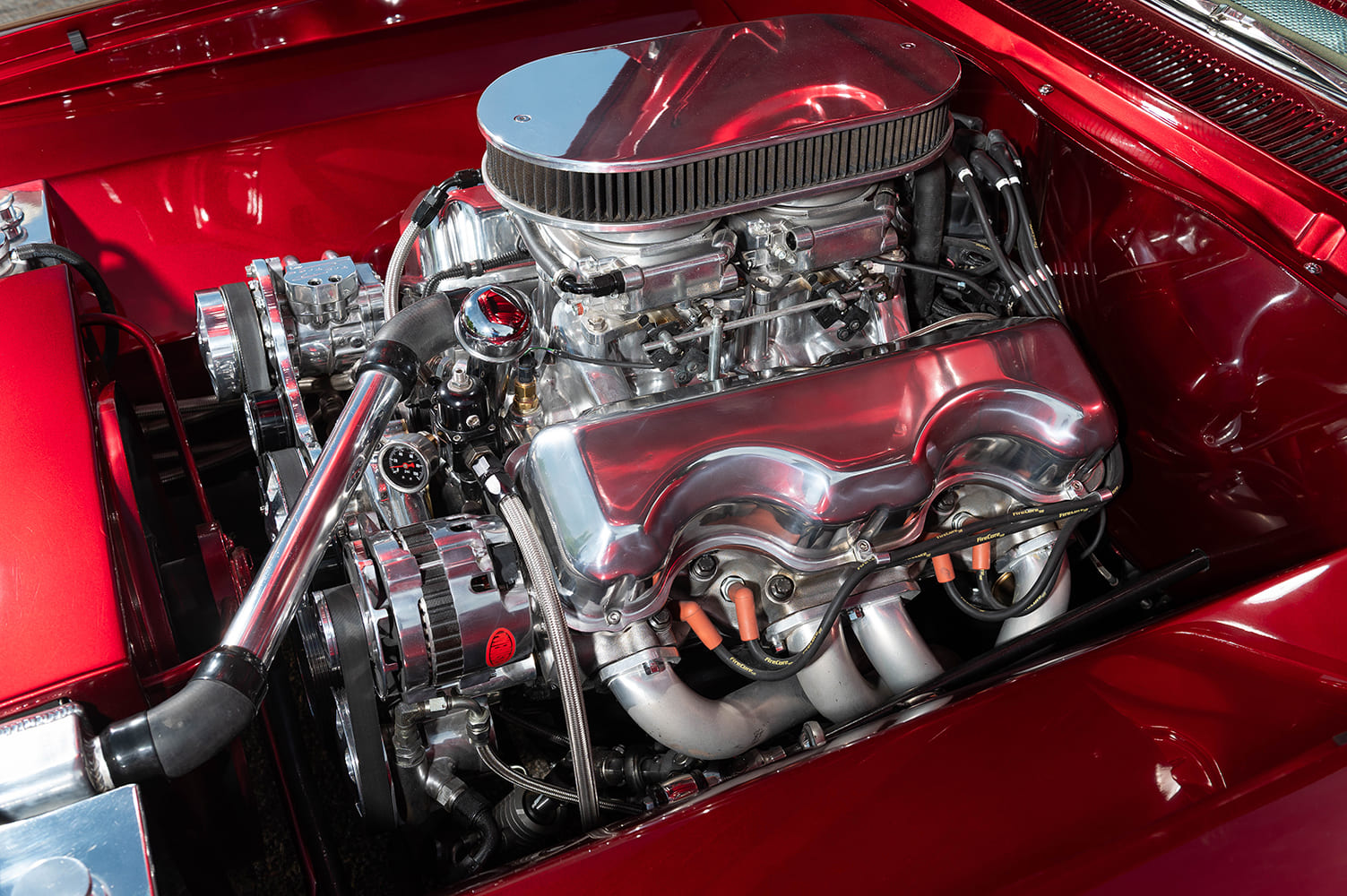 Rick aimed to stay true to the car’s original DNA at its core. The factory 409ci V-8, now sporting lots of chrome and polish, stayed the main feature but received some modern updates. The legendary W-engine was bored 0.030 over, equipped with Keith Black pistons and Scat Pro rods, and built with a Comp Cams setup with a deep, lopey idle. Adding a Holley Sniper EFI dual-four throttle body system and Edelbrock polished intake improved driveability, while a Sniper HyperSpark ignition ensured quick startups. A Billet Specialties Tru Trac front runner dressed up the front of the engine, making the engine bay as impressive as the body itself.