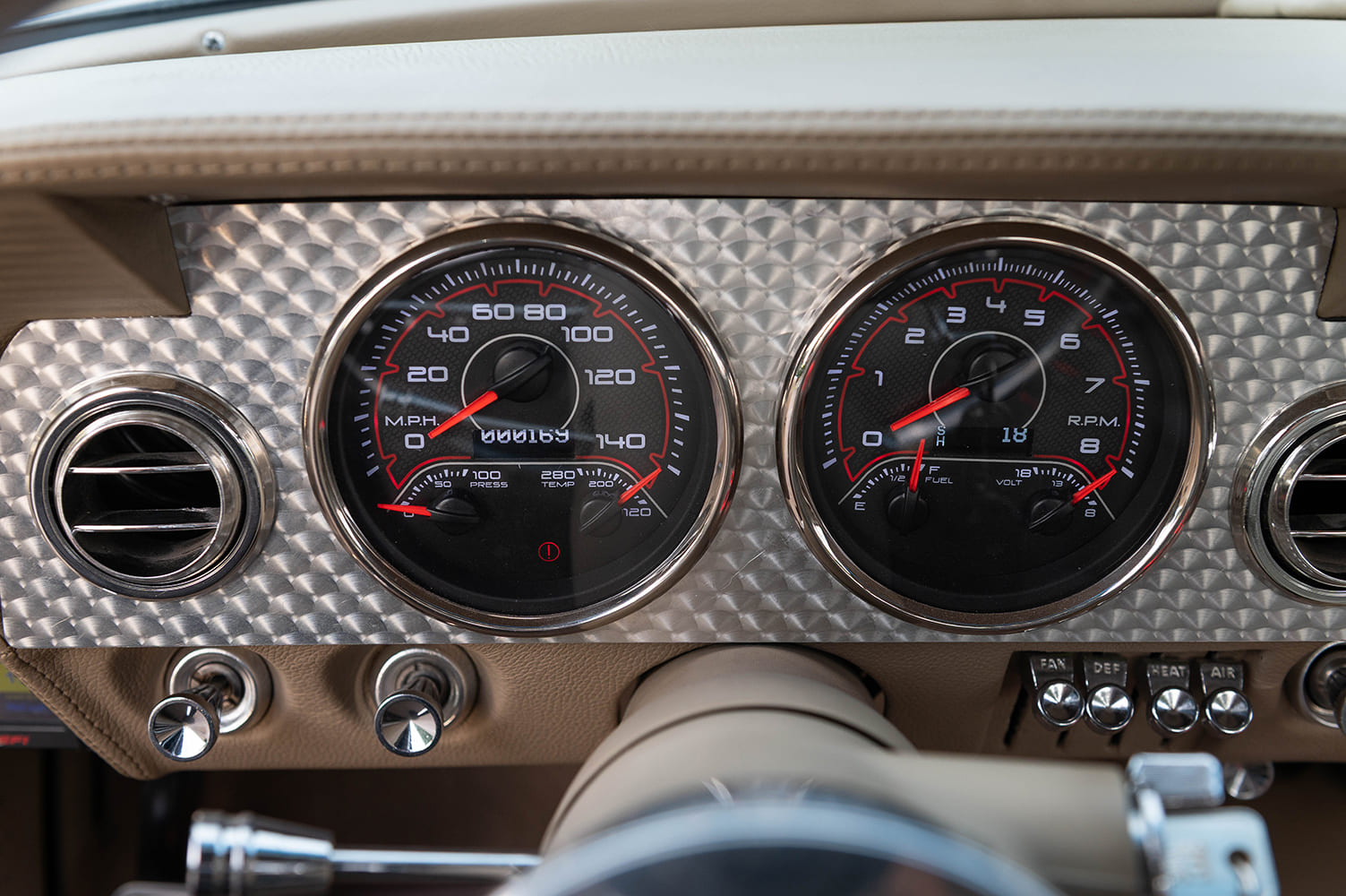 With the body and drivetrain finished, the Impala was trailered back to Haysville, where Dale England at Plum Crazy Kustoms took charge of the interior. The dash was handcrafted into a sleek, flat-face design that sets the tone for the cabin. Vintage USA gauges were installed within an engine-turned panel, wired through an American Autowire harness, and complemented by a Billet Specialties steering wheel mounted on a Flaming River column.