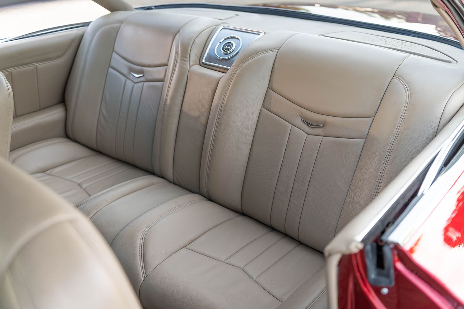 To beat the Kansas summer heat, a complete Vintage Air system was installed for modern climate control. Front seats from a 1993 Chevy Lumina were reworked and upholstered in supple Italia Beach leather, offering comfort without sacrificing style. The rear bench from the Impala had to be custom trimmed and rebuilt to fit the widened rear tubs that make room for Boyd Coddington’s wheels.